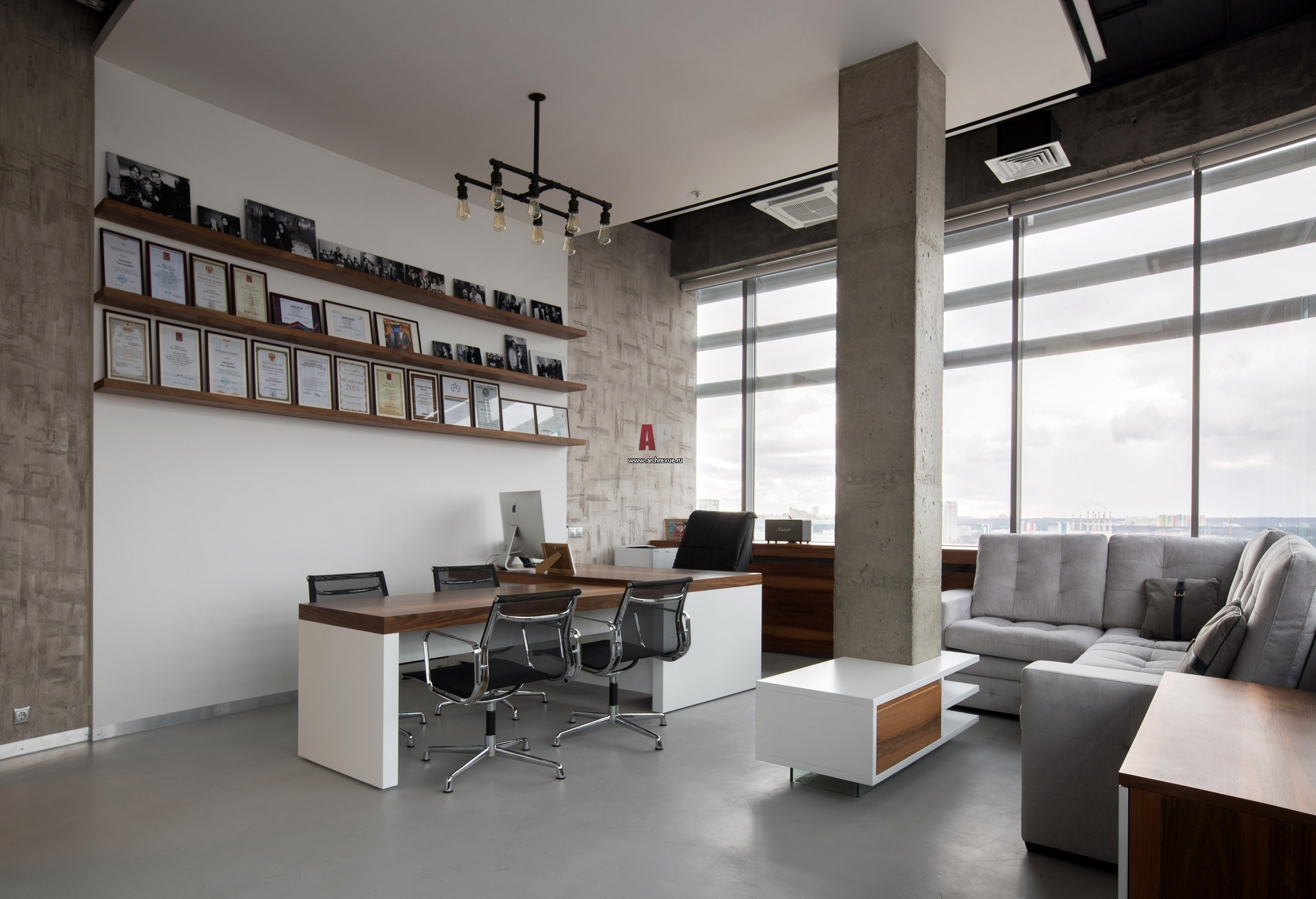 Кабинет генерального директора радиостанции «Новое Радио». Стены и пол оформлены покрытиями с эффектом бетона. Рабочий стол, встроенная в колонну тумба сделаны на заказ.