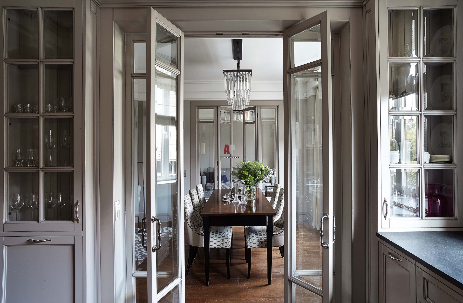 Две пары дверей (между приватной гостиной и гостиной-столовой и между гостиной-столовой и кухней) создают эффектную анфиладу. Столовая группа, Arte Brotto, Morelato.
