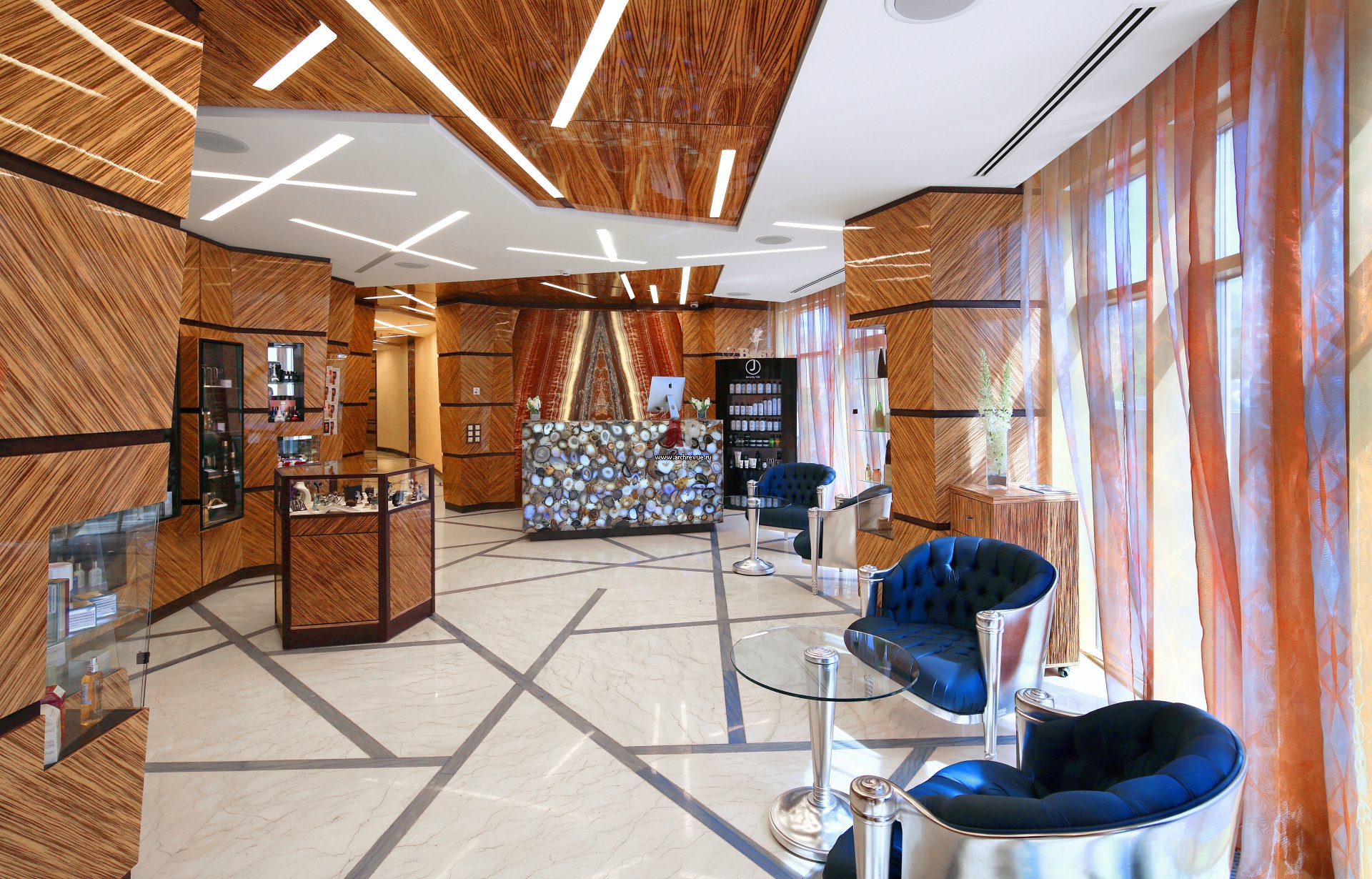 Сложный рисунок потолка повторяет раскладка пола из светлого мрамора и голубого гранита.