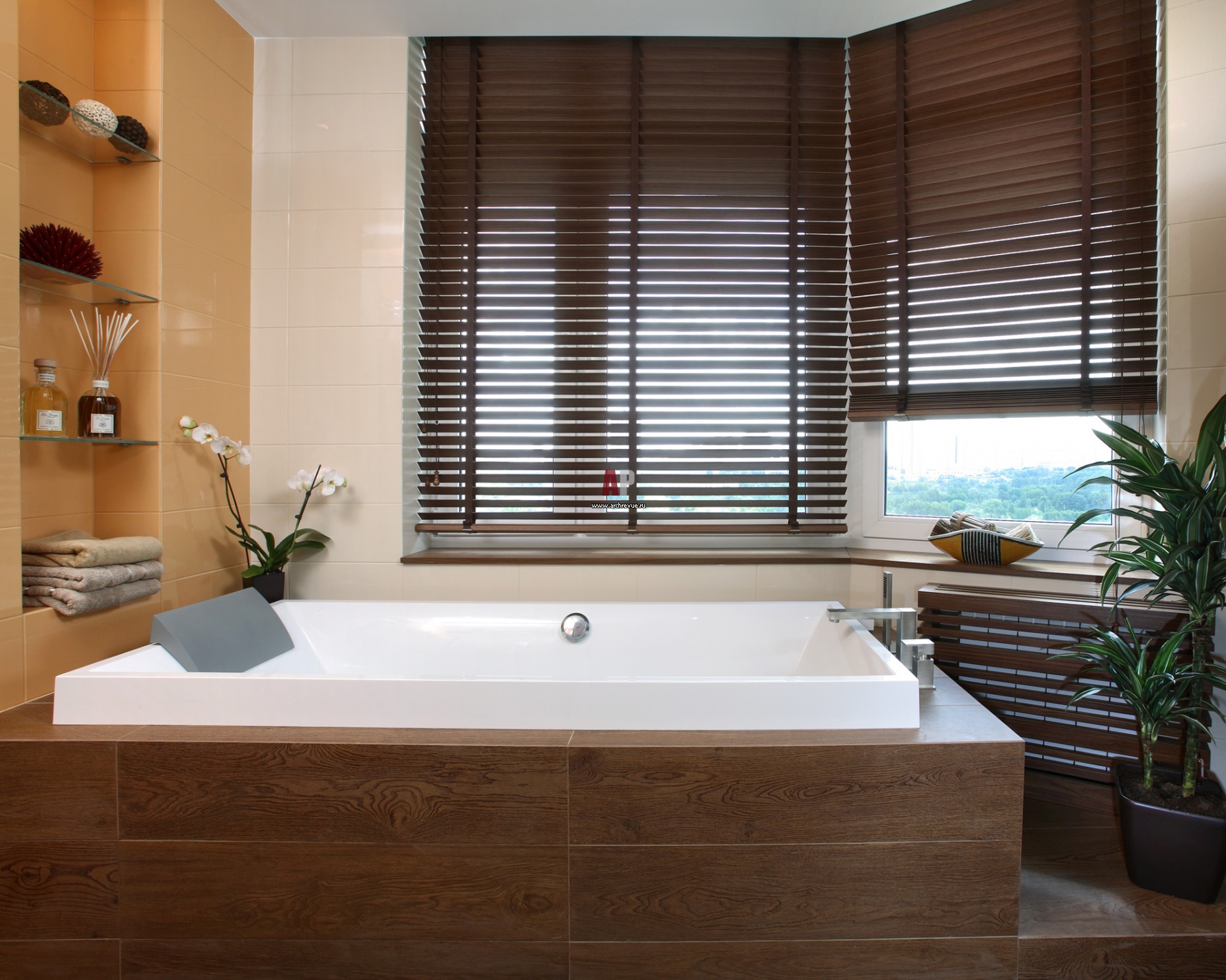 Дизайн ванной комнаты с угловым окном в квартире. Пол и подиум, куда встроена ванна с гидромассажем, облицованы керамогранитом с имитацией дерева темного цвета. Деревянные жалюзи на окнах в духе традиционных азиатских интерьеров.