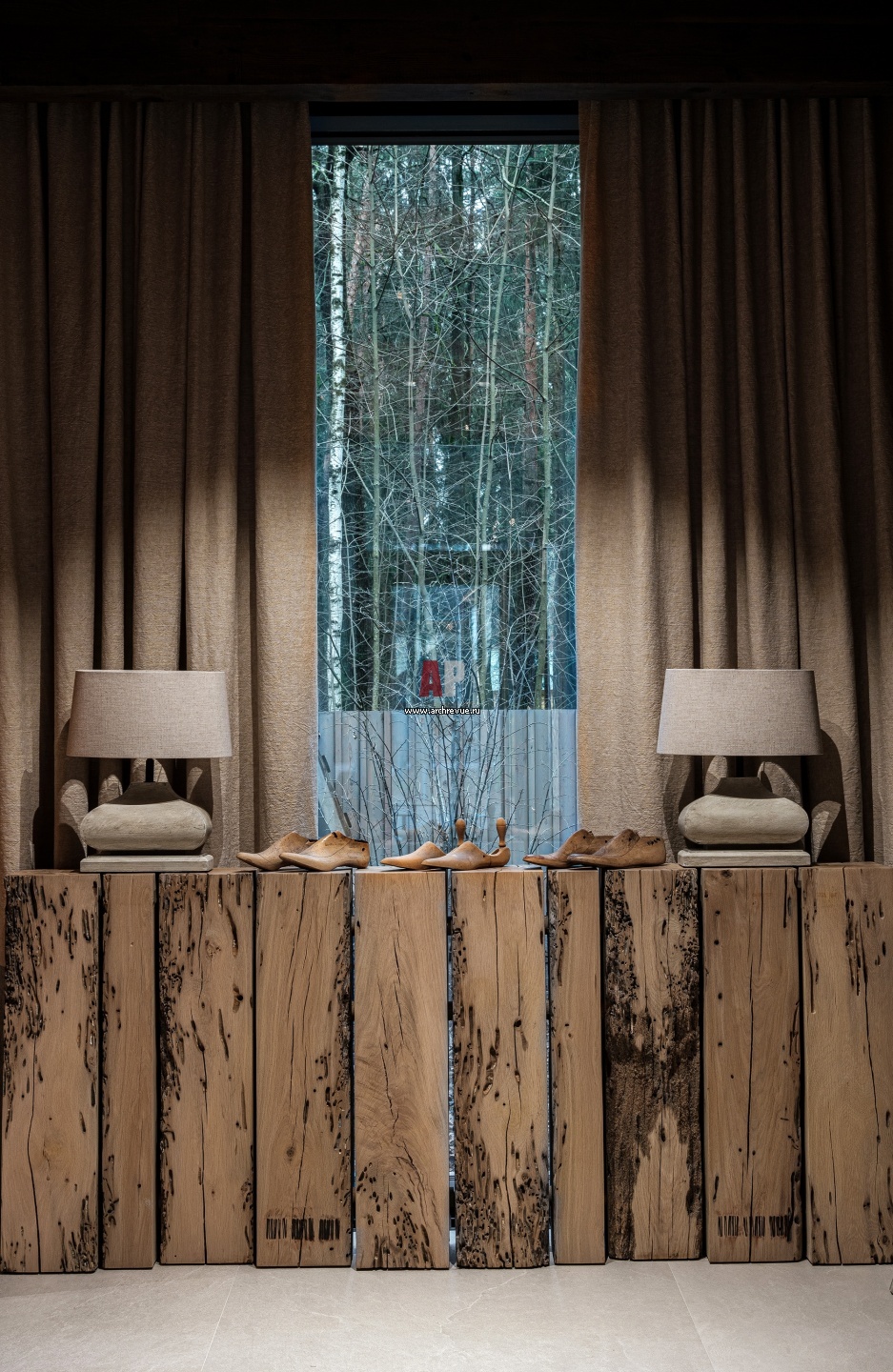 Частная резиденция в духе бельгийских домов. Прихожая на первом этаже. Консоль из дерева с активной текстурой, Riva 1920.