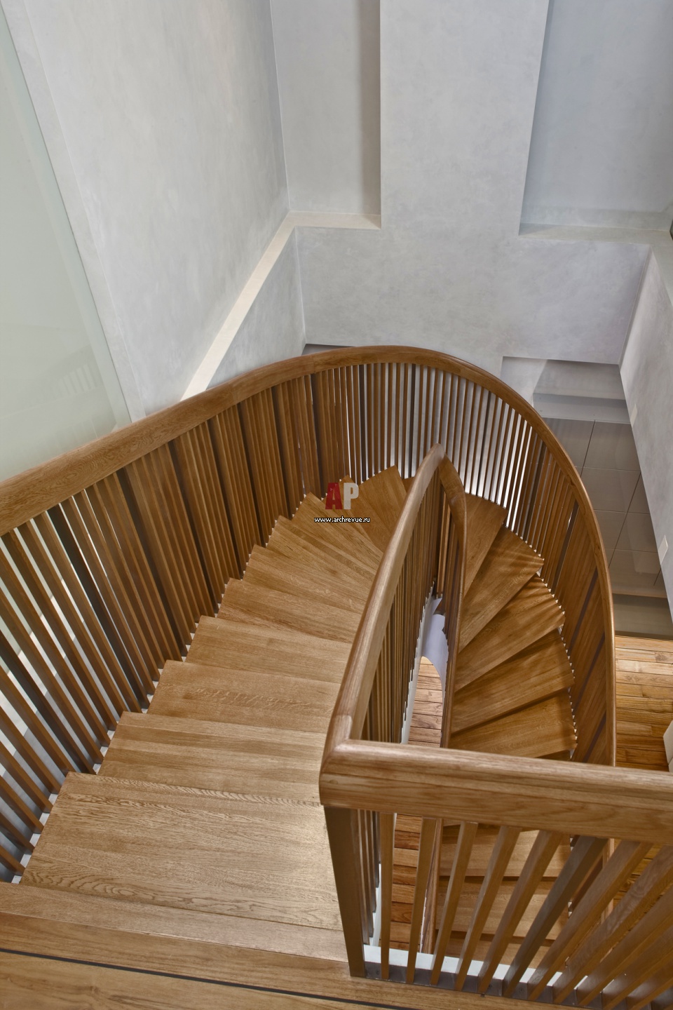Ступени лестницы облицованы тиком. Ограждение набрано из тонких деревянных реек.
