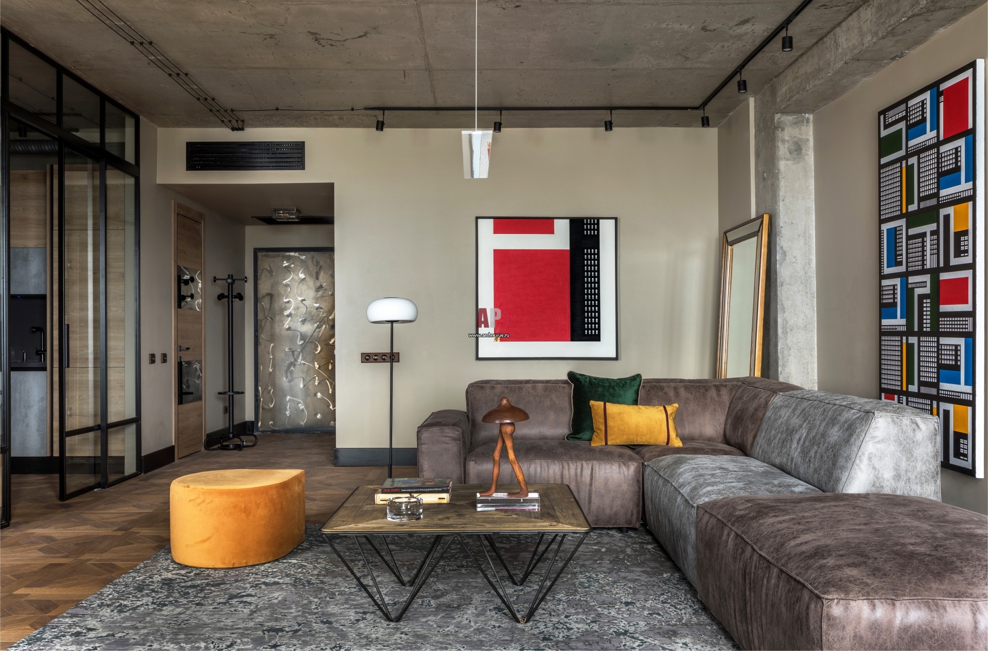Стены общей зоны выкрашены в теплый бежевый оттенок. Потолки и колонны оставлены бетонными, на них эффектно выглядит внешняя ретро-проводка. С входной двери снят декоративный слой до стальной основы. Торшер, Marset.