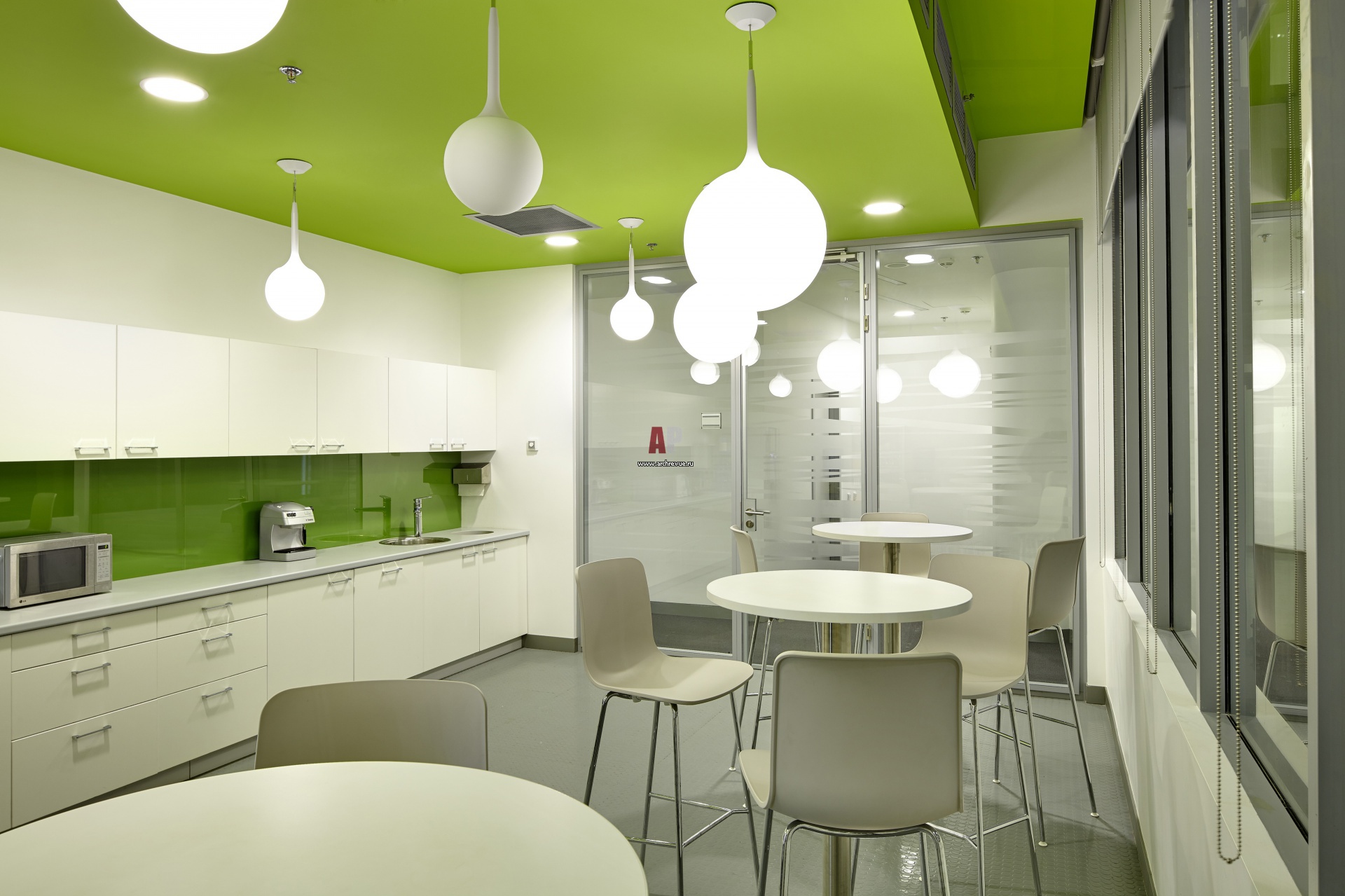 Кофе-поинт и небольшая кухня есть в каждом крыле типового этажа, ее отделка решена в своем индивидуальном цвете.