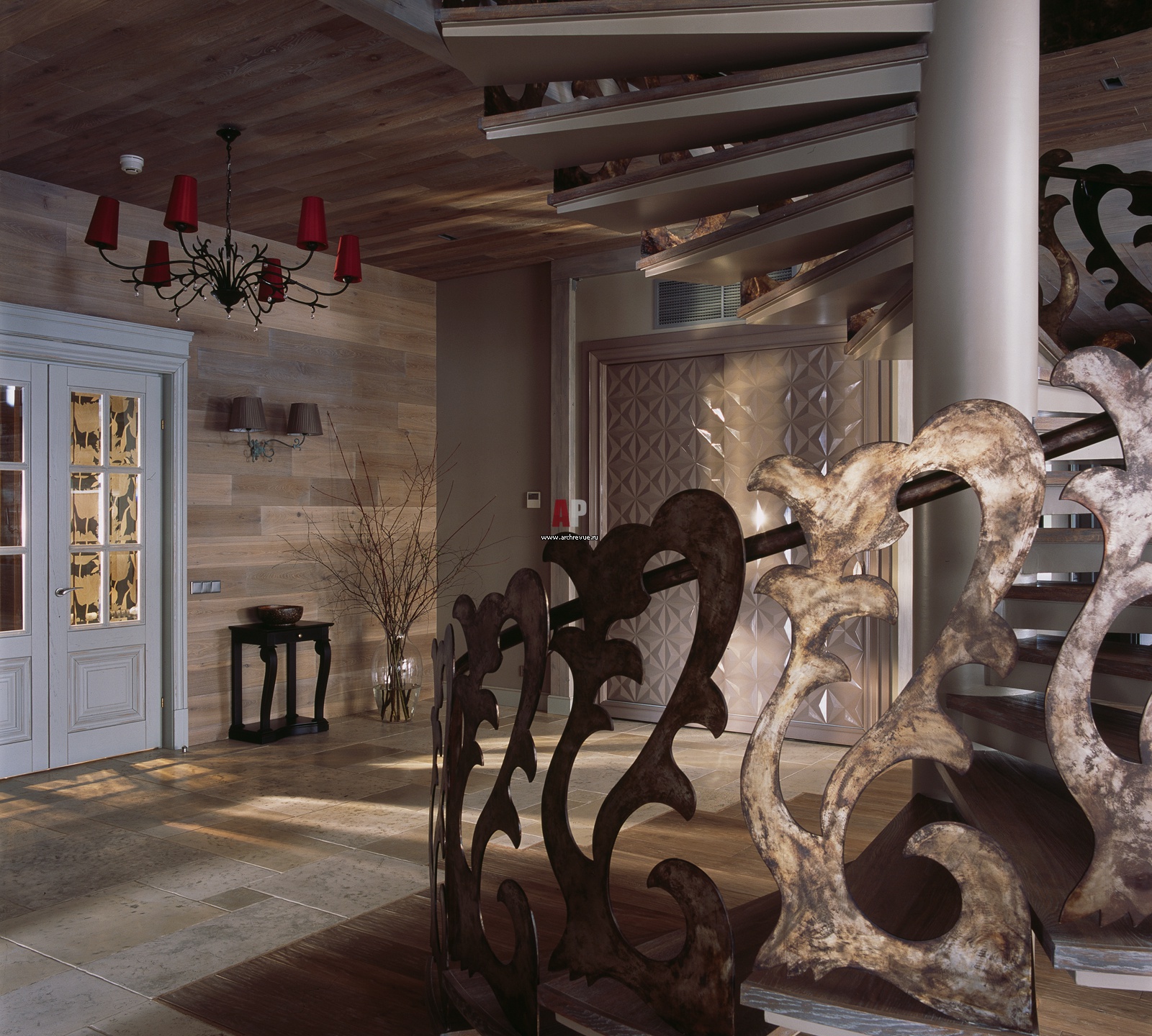 Ядро гостиной – винтовая лестница с резным ограждением из патинированного металла, изготовление ArtNobilisGroup. Орнамент ограждения – «турецкий огурец». Двери выполнены на заказ по эскизам дизайнера проекта.