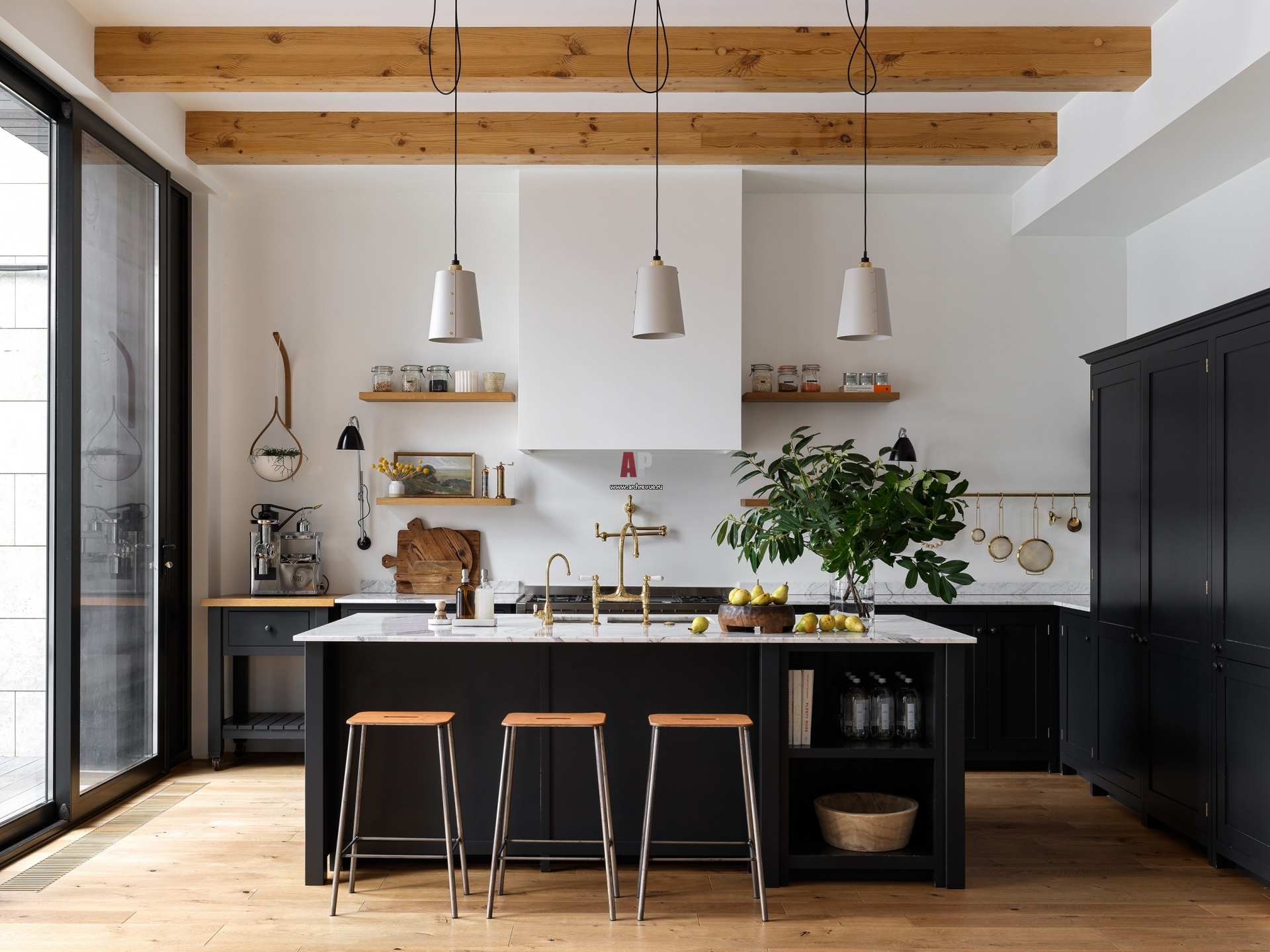 Усадьба Botanica House. Собственный дом дизайнера в Подмосковье. Кухня. Потолочные балки акцентируют высоту помещения.
