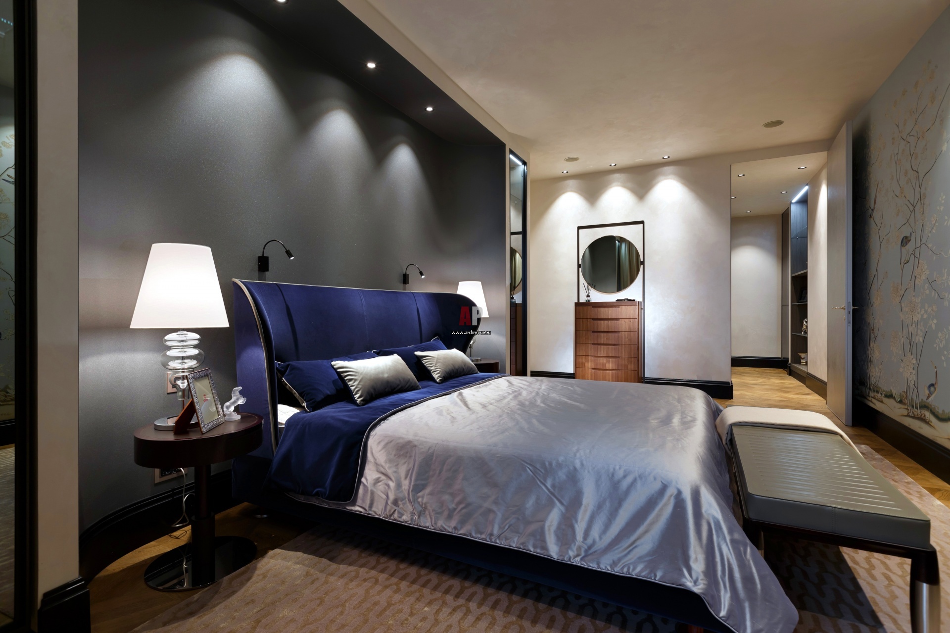Интерьер спальни с ультрамариновыми цветовыми акцентами в квартире с элементами ар-деко. Кровать, кресло, Giorgetti. Покрывало, шелк, окантовка из бархата, Dedar.