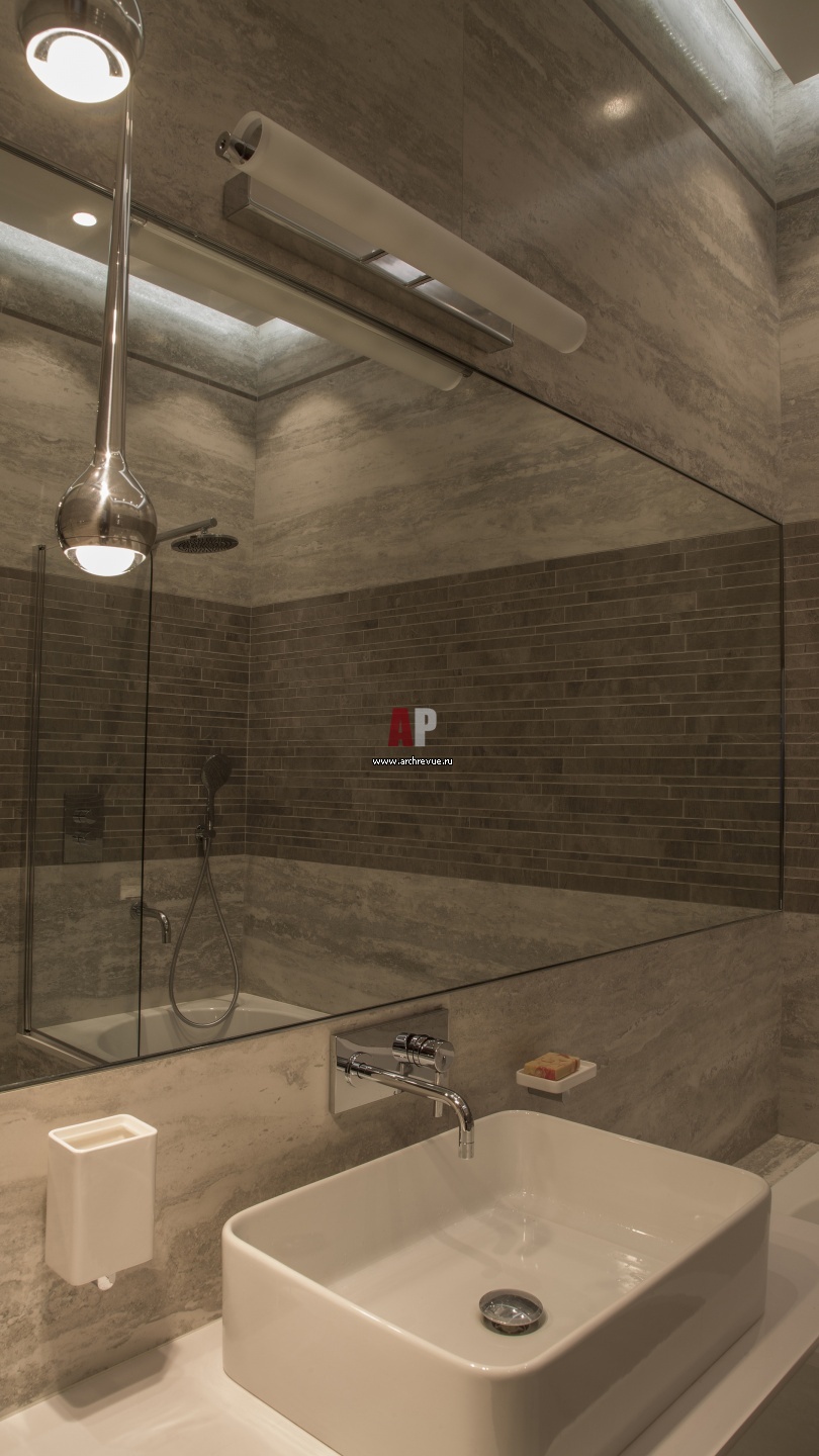 Стены и пол детского санузла отделаны камнем. Потолок оформлен панелями МДФ, выкрашенными в белый цвет, с закарнизной подсветкой. Панели отодвигаются, обеспечивая доступ к коммуникациям. Работы по дереву, компания «КингВуд». Раковина, Antonio Lupi.
