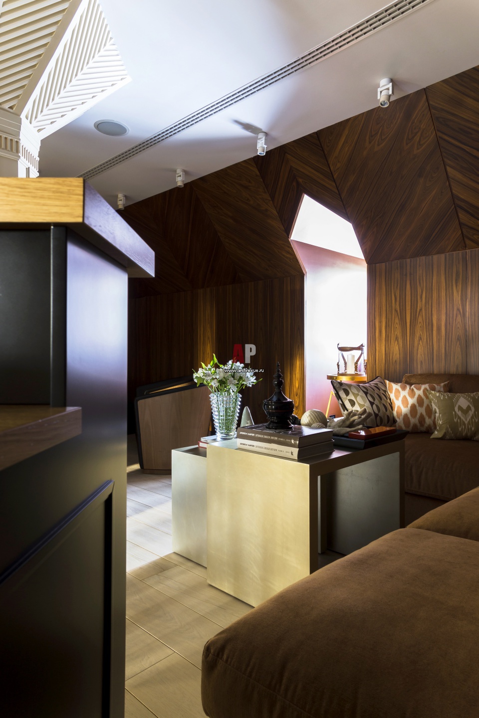 Мансардный этаж. Стены, деревянные панели, палисандр. Кресла, Ralph Lauren. Столики, Henredon (by Barbara Barry).