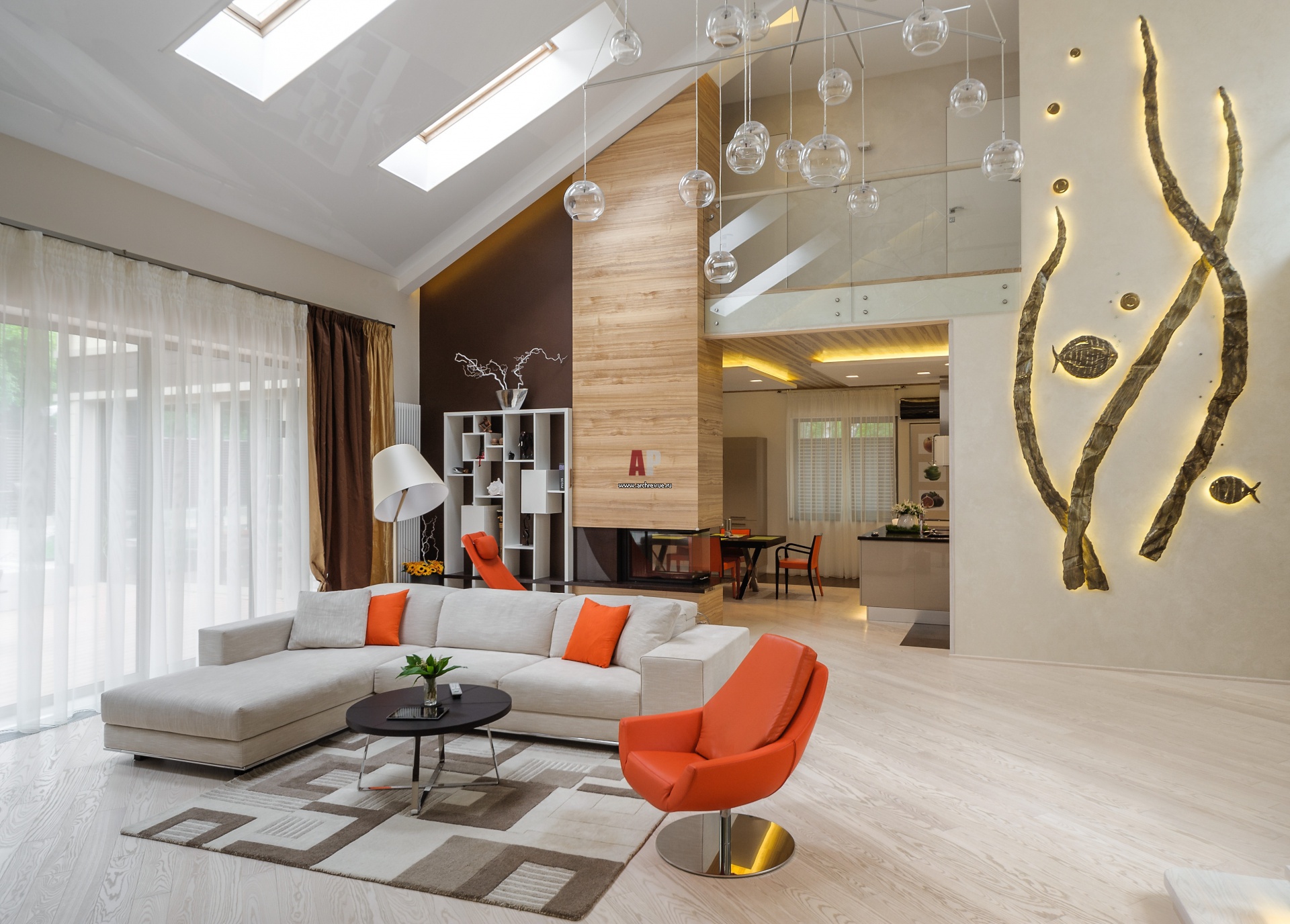 Интерьер гостиной с панорамными окнами. Для освещения высокого объема их оказалось мало, поэтому были прорезаны мансардные окна. Авторский светильник из стеклянных шаров на металлических тросах не перекрывает свет.