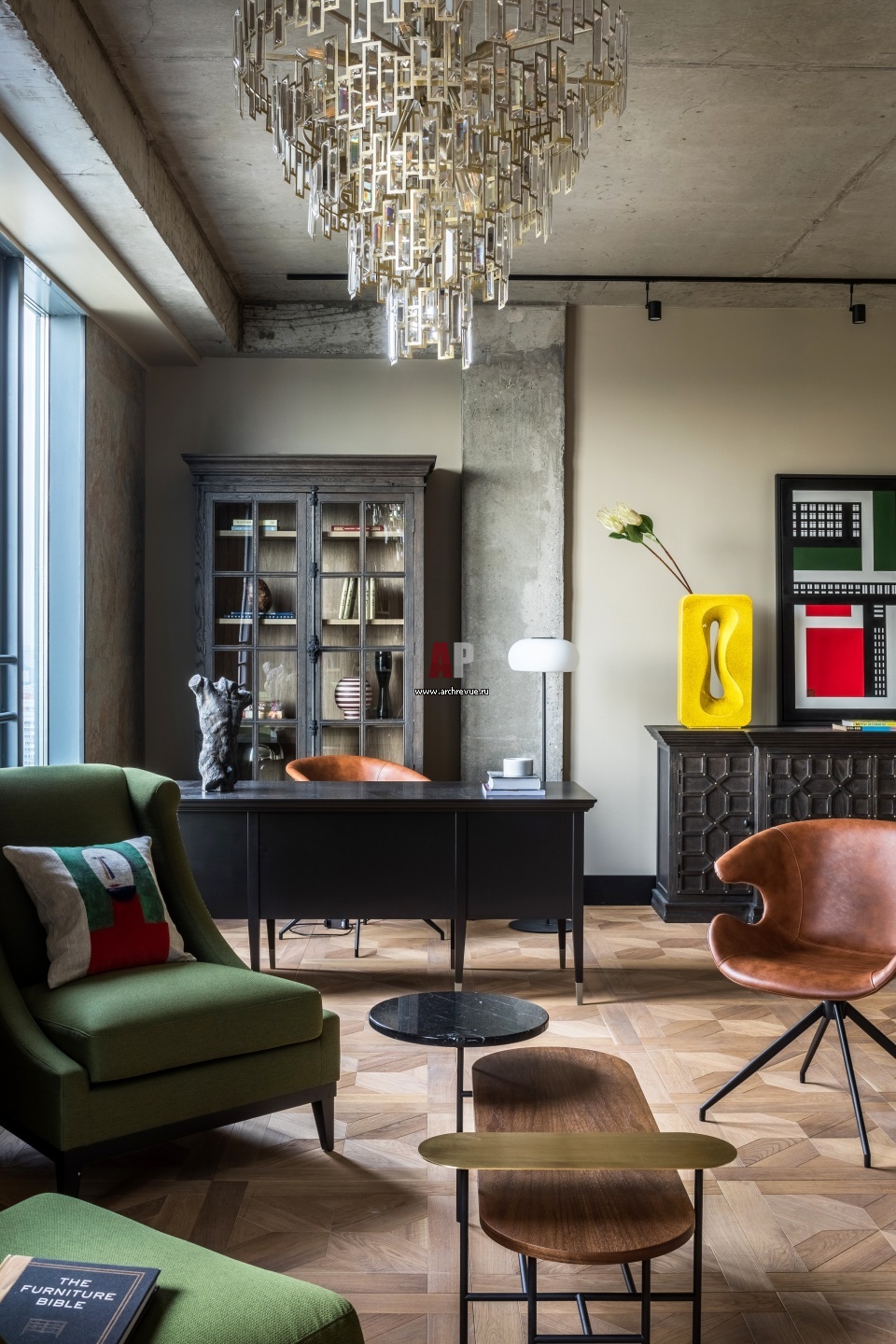 В общей зоне две рабочие группы со своими письменными стелами и шкафами для документации. Письменные столы, кресла, буфет, Dantone Home. Кофейный стол, &Tradition. Каскадная ретро-люстра, MW-Light.