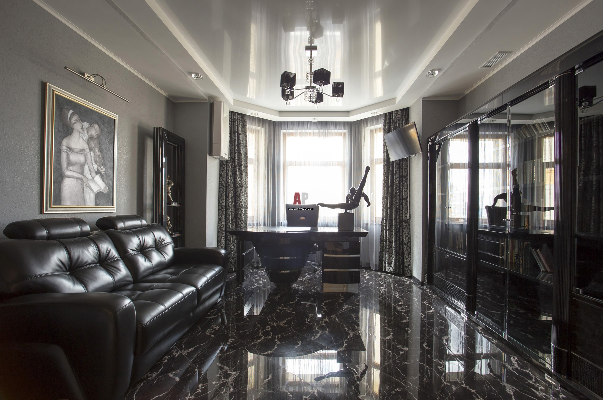 На фото – интерьер черно-белого мужского кабинета в стиле ар-деко. На полу – пестрый темный керамогранит Peronda. Мебель из полированного черного дерева с инкрустацией из кожи, Turri.