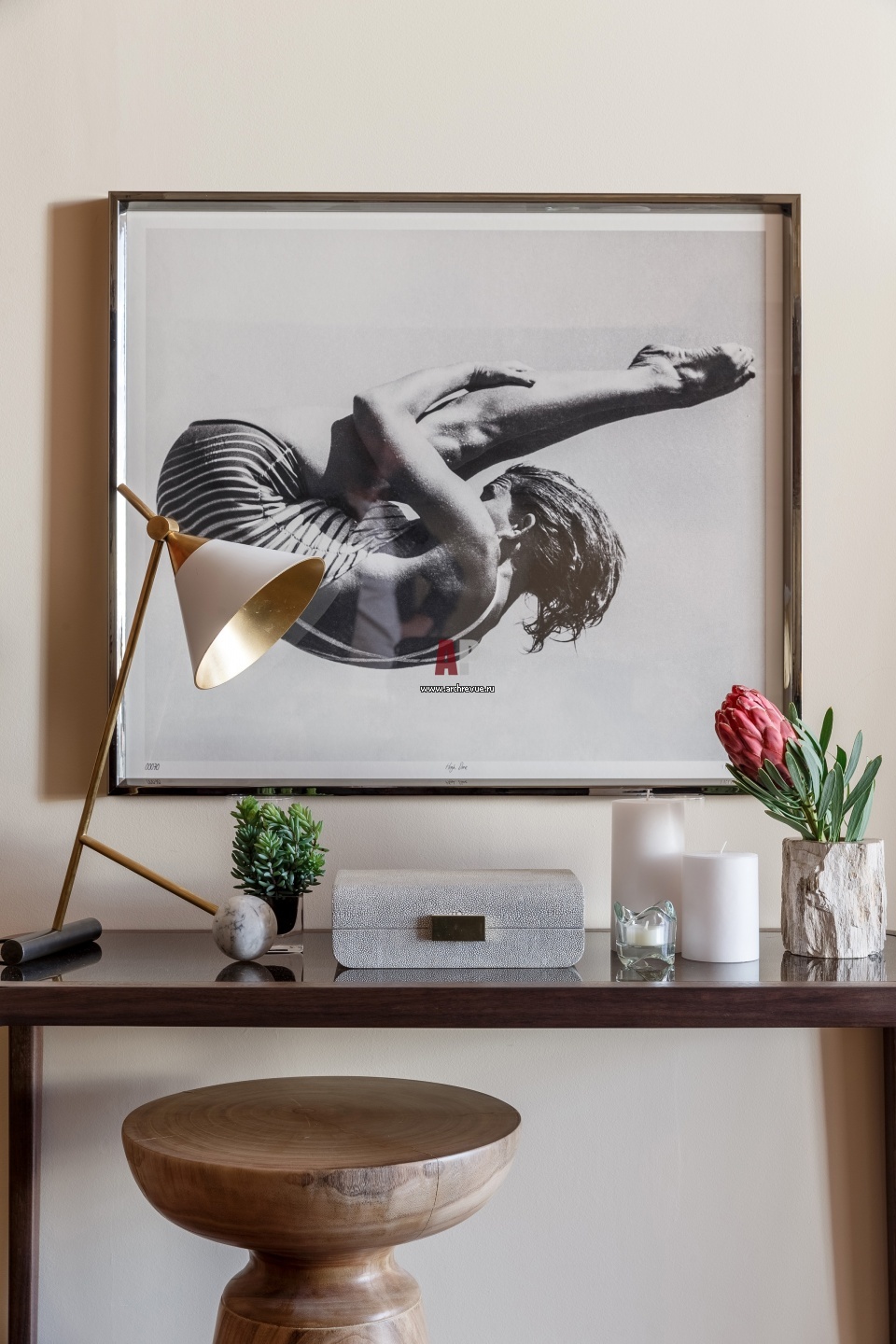 Интерьер прихожей. Консоль и табурет, MHLiving. Лампа, Visual Comfort & Co, по дизайну Kelly Wearstler.