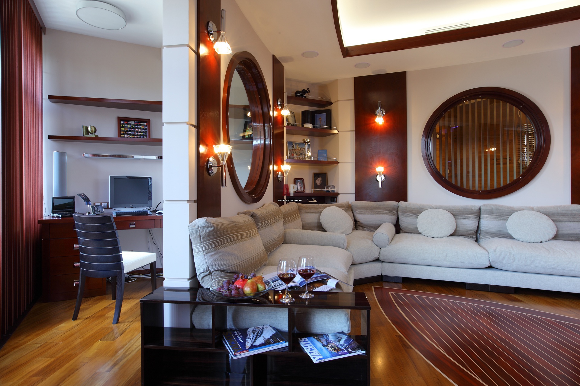За перегородкой с декоративным окном-иллюминатором расположен небольшой кабинет хозяина дома.