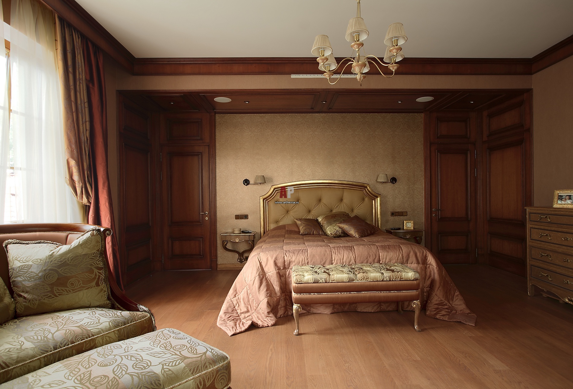 Спальня решена в классическом стиле. Основной прием ее декорирования – деревянное панелирование. Оно гармонирует с обоями в розовато-золотой цветовой гамме.