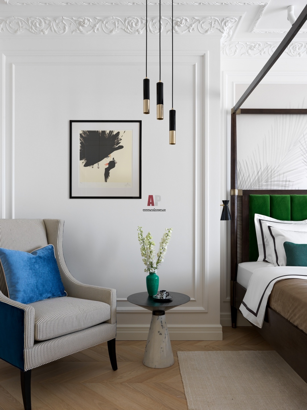 Хозяйская спальня. Подвесные светильники, Delightfull. Кресло, Jessica Charles. На стене – картина работы Рене Грюо.
