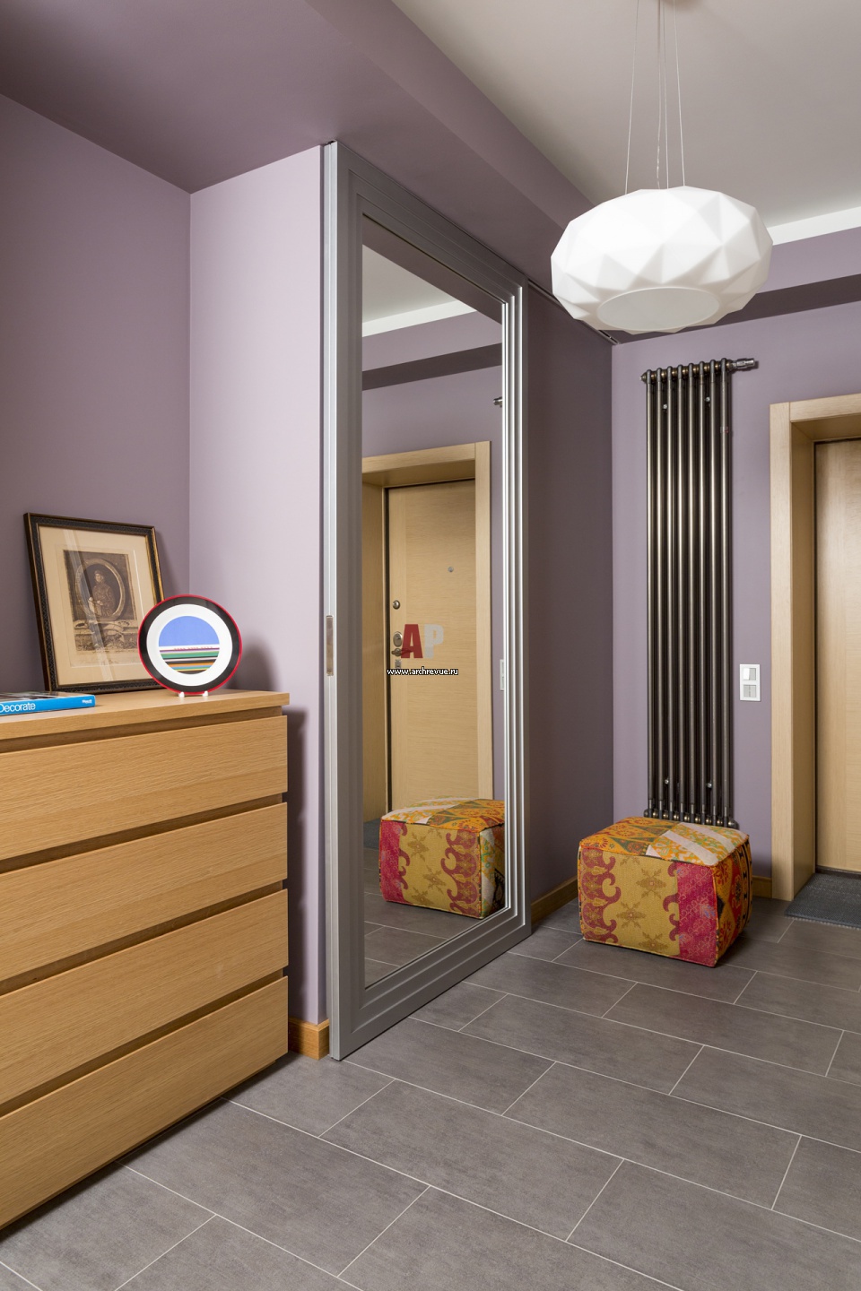 На фото – интерьер прихожей с зеркальным шкафом. Стены и многоуровневый потолок лавандового цвета.