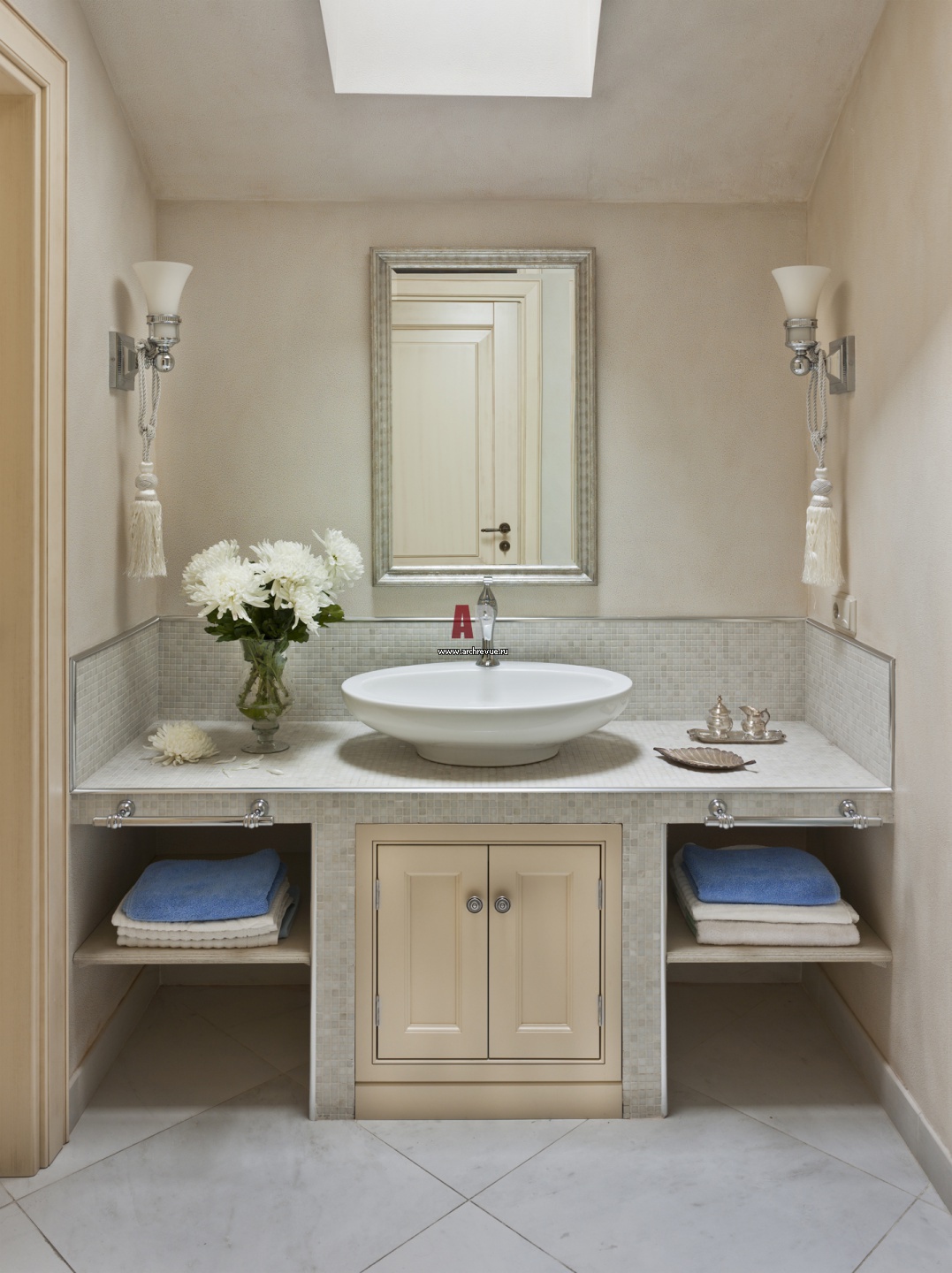 Фото интерьера ванной комнаты с мансардным окном. Облицовка полов – керамогранит GranitiFiandre (коллекция Extreme), поставщик BARS RED. Умывальник отделан мраморной мозаикой.