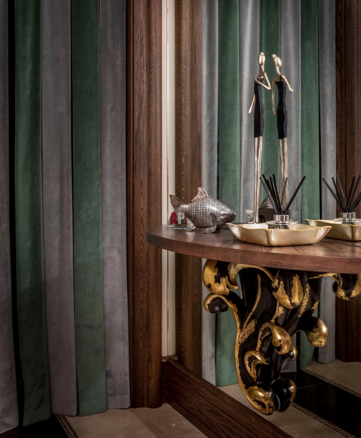 Фрагмент интерьера прихожей. Портьера сшита из бархата двух цветов: изумрудного и лавандового. Статуэтка на консоли привезена из Франции.