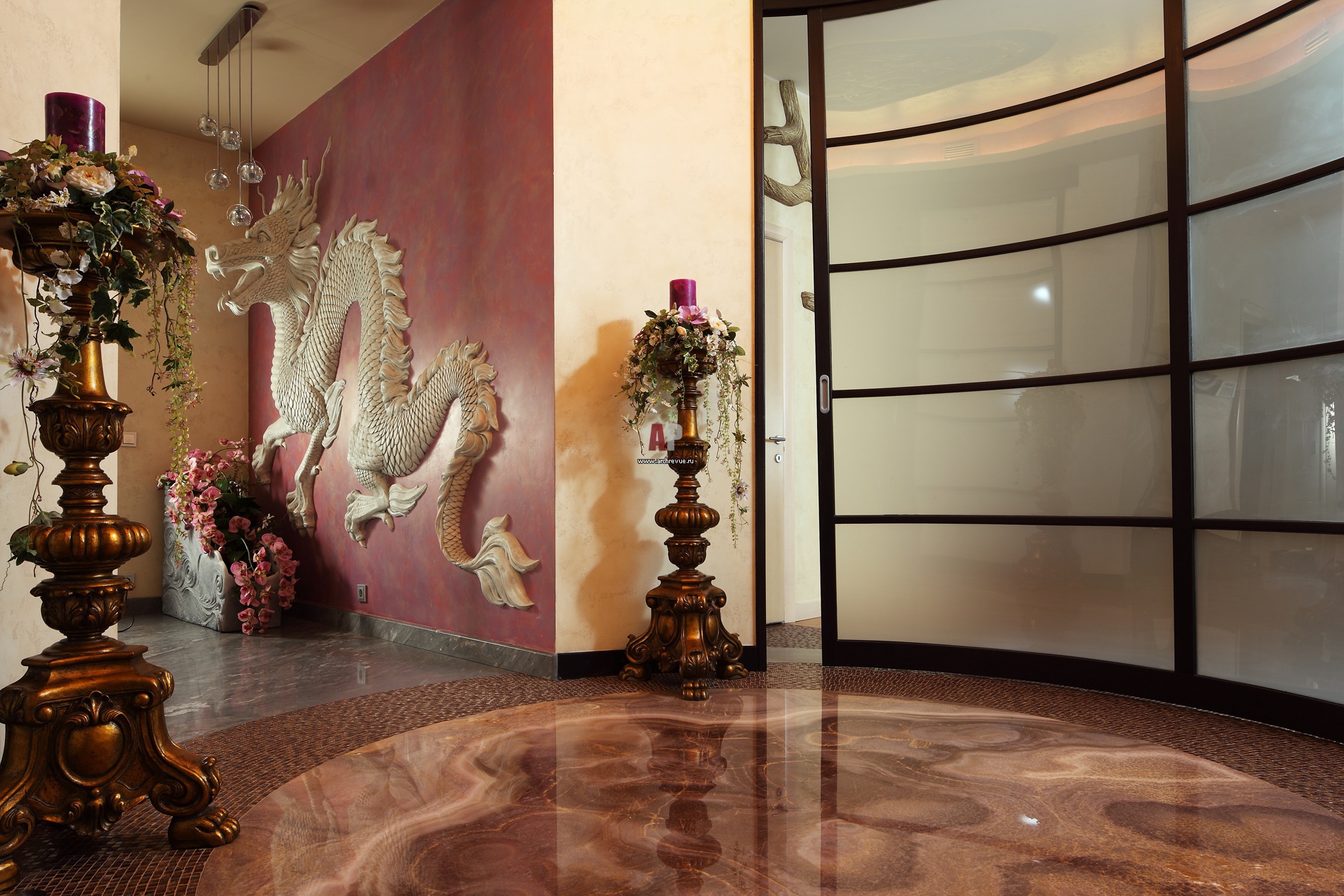 Центр круглого холла акцентирован круглым слэбом из оникса, поставщик «Интеркамень сервис». Он окантован блестящей мозаикой.