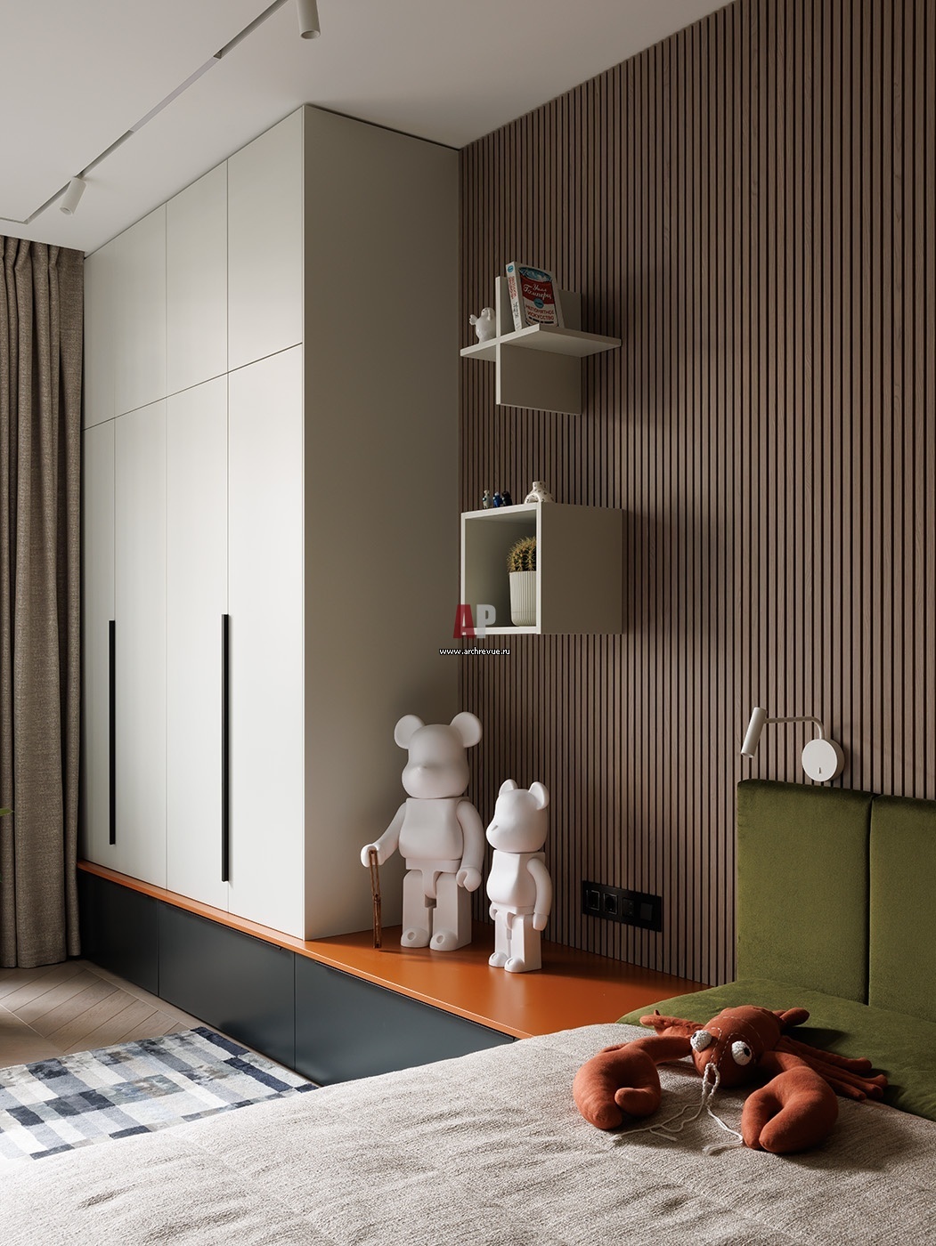Цветовым акцентами в детской служат сложный зеленый, оранжевый и оттенок натурального шпона в отделке стены за кроватью