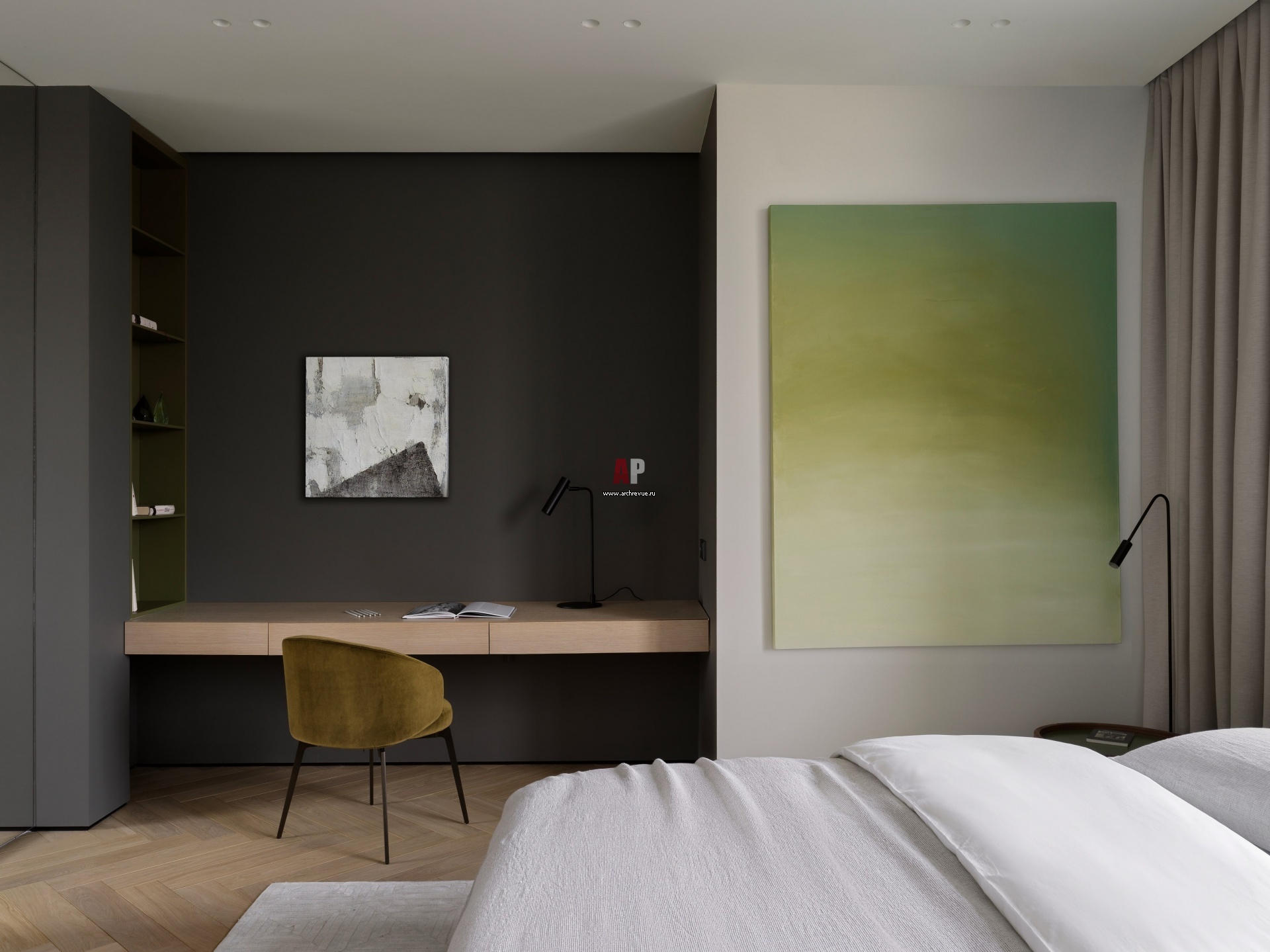 Гостевая спальня оформлен в сложных коричнево-зеленых оттенках. Картина Кирилла Басалаева.