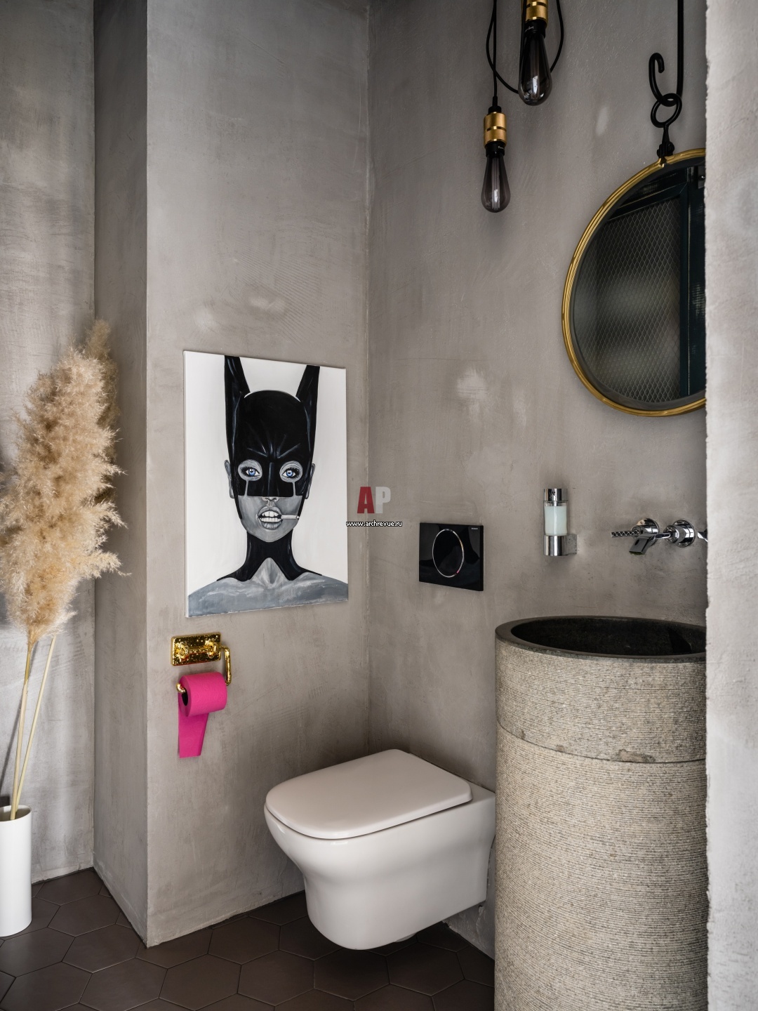 Гостевой санузел. Напольная раковина сделана из камня. Светильники, Buster + Punch. Инсталляции, Geberit.