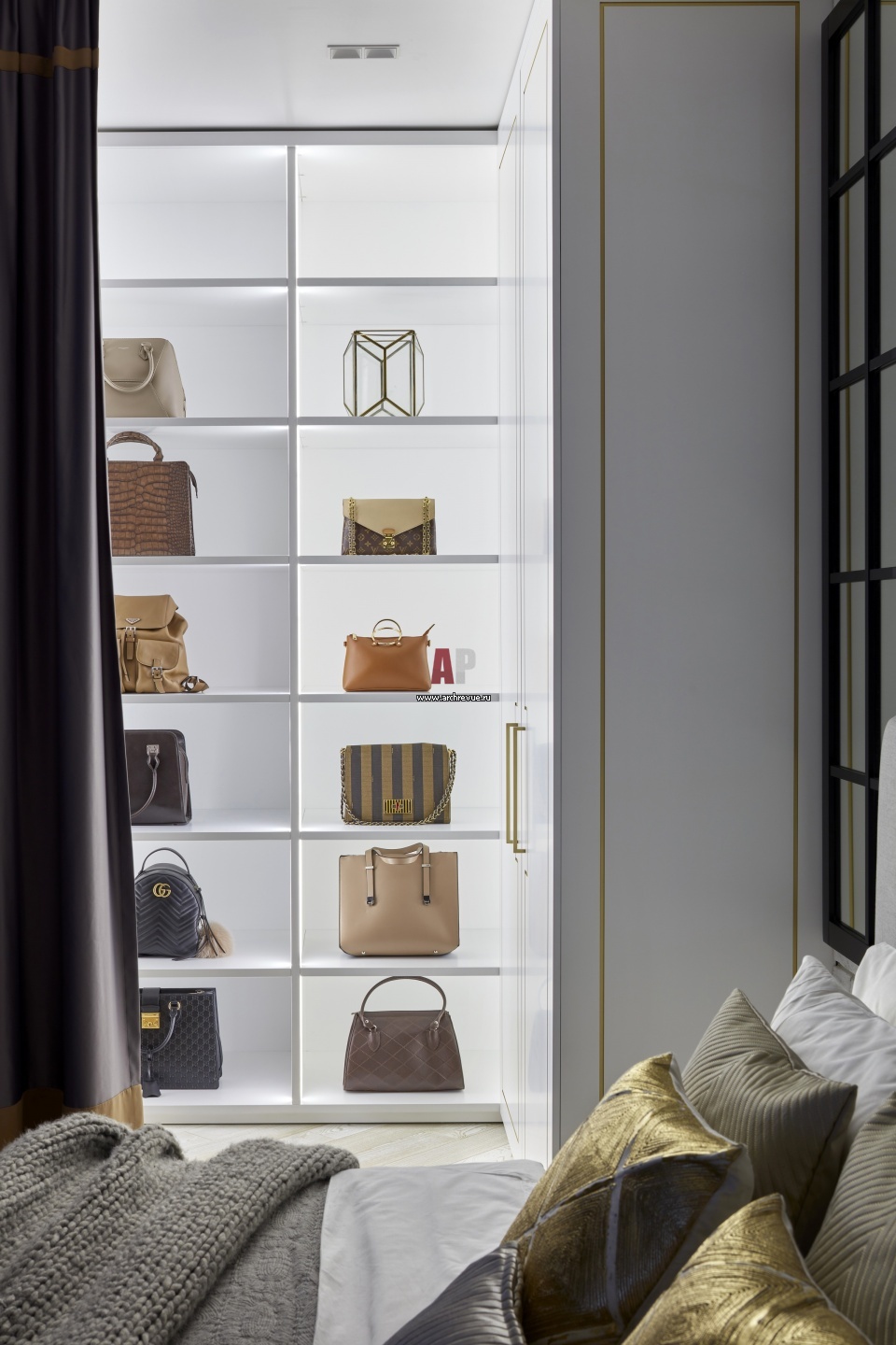 К спальне примыкает гардеробная комната площадью 6,6 кв. м. Системы хранения, стеллажи с подсветкой сделаны нам заказ по эскизам дизайнера.
