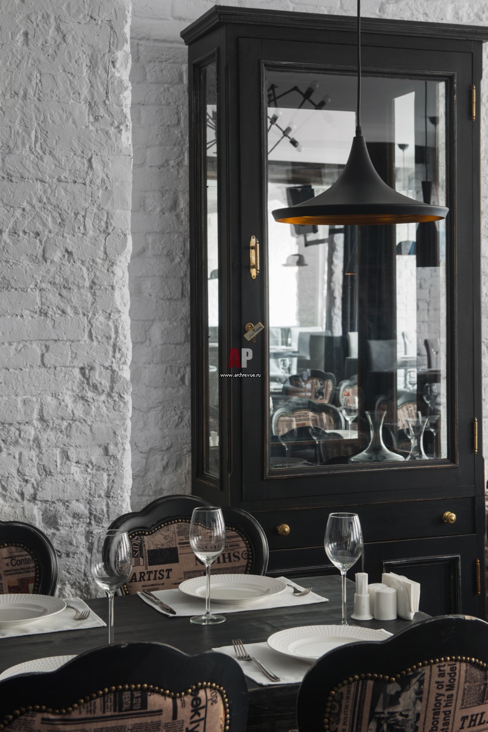 На фото – интерьер зала ресторана. Черные с патиной витрины выглядят строго и благородно на фоне белых стен.