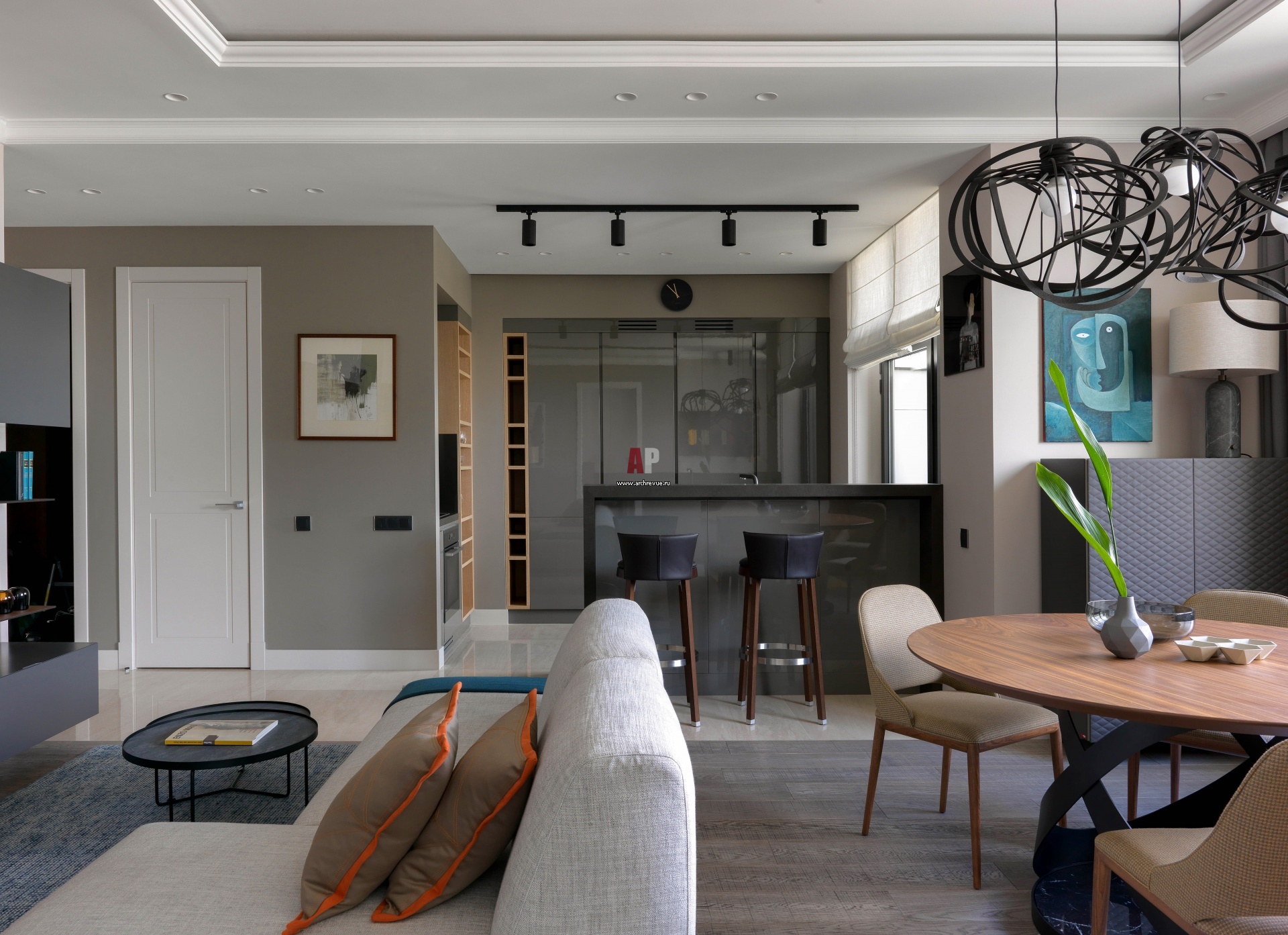 Центральное помещение квартиры – многофункциональный open space, включающий гостиную, кухню, столовую, рабочую зону и зону для вечеринок и коктейлей. Диван, DiTre Italia. Журнальные столы, комод-бар Cattelan Italia. Светильник на шине, встроенные светильники, TAL.