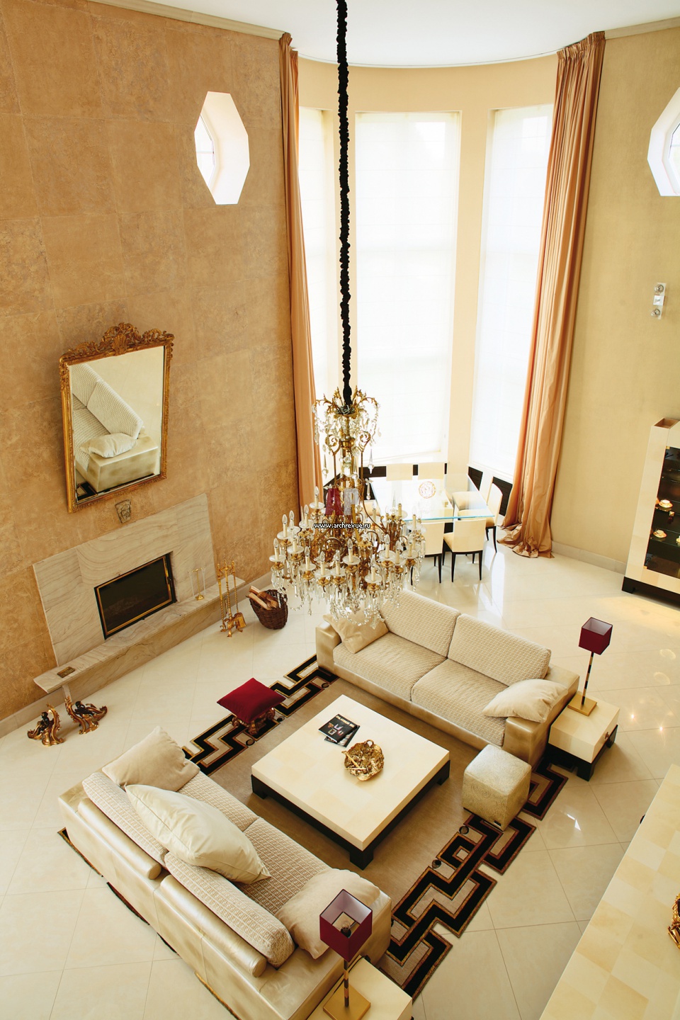 Двухсветная гостиная – композиционный центр общественной зоны. Вокруг нее в четырех эркерах-башнях распложены функциональнее зоны кухни, столовой, диванной, а также лестничный марш и лифтовой холл.