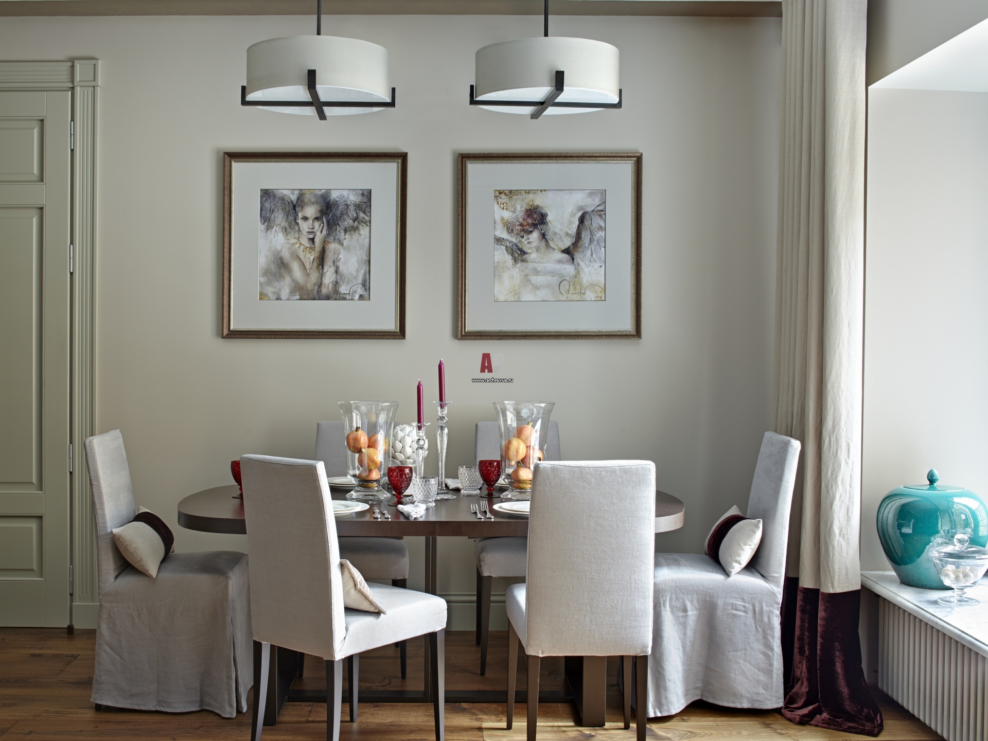 Зона столовой в дизайне общей гостиной. Стены выкрашены в сложный светлый серый цвет, использована матовая однотонная краска Farrow & Ball. Шторы выполнены из льна с широким бархатным кантом шоколадного цвета. Столовая группа, Meridiani.