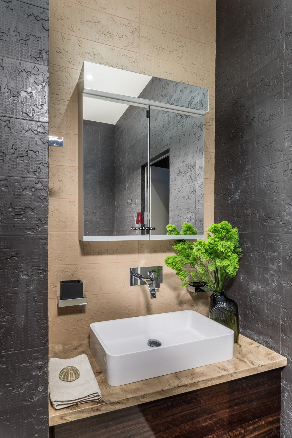 Санузел при спальне старшего сына (3 этаж, верхний уровень). Подвесной светильник, De Majo Illuminazione. Плитка, Mutina. Тумба из шпона эвкалипта на заказ.