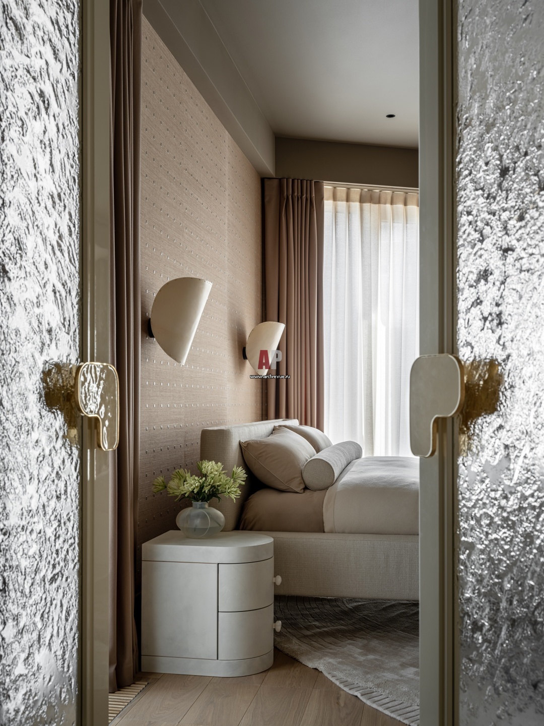 Двери и «морозные» витражи изготовлены на заказ. Ручки на дверях также авторские, настоящие ювелирные изделия из латуни и эмали. Их форму дизайнеры позаимствовали у пластики дивана в гостиной.