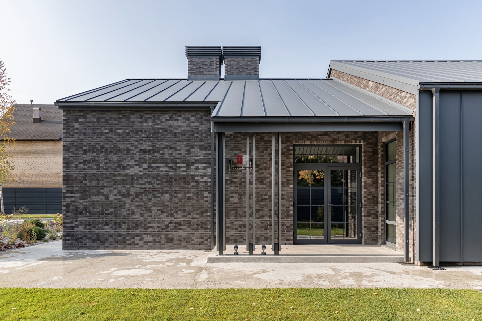 В отделке фасадов использован клинкерный кирпич темного серого цвета ABC Klinkergruppe и графитовый фальцевый металл.