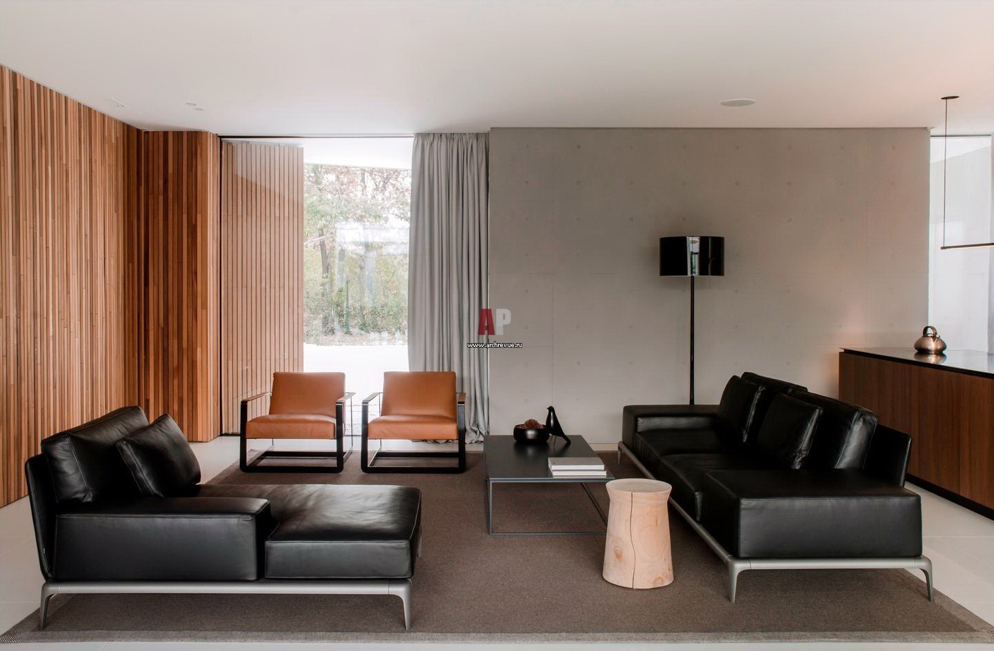 Интерьер дома практически монохромный: серый, черный и рыжая кожа кресел Poliform – вот его основная палитра.