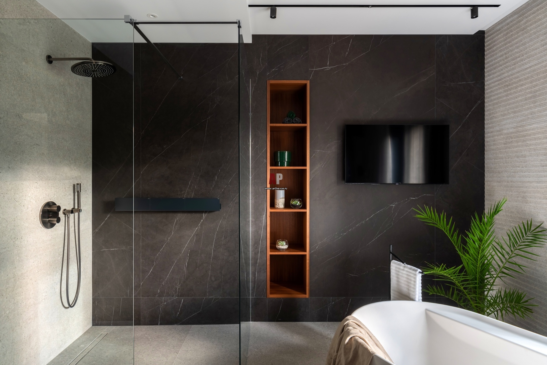 Большая ванная комната при хозяйской спальне включает отдельно стоящую ванну, душевую и зону умывальника с двумя раковинами. На стенах и на полу – керамогранит, Porcelanosa. Душевая система, Grohe.
