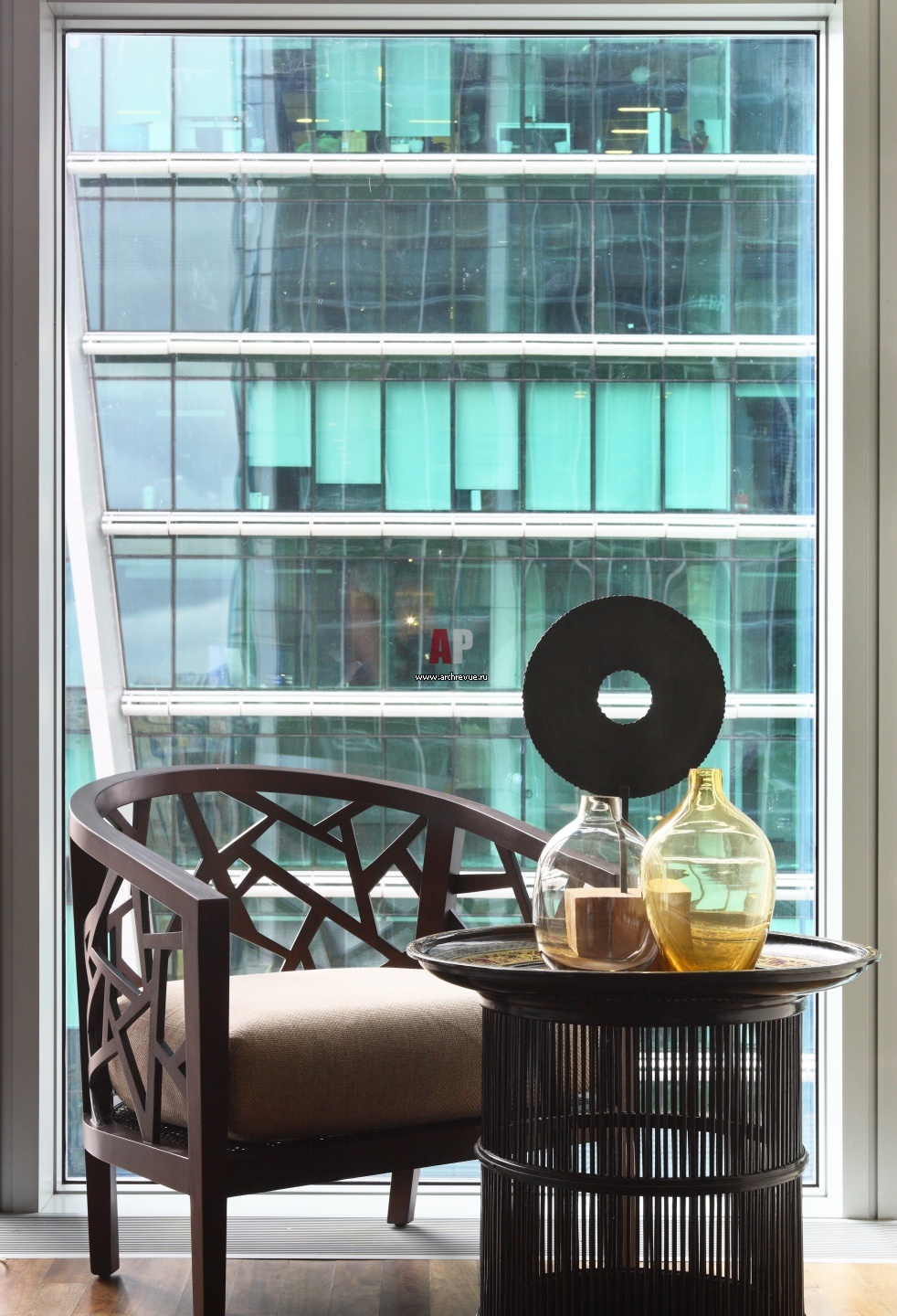 Интерьер панорамной квартиры в высотке. Кресло, вазы и аксессуары, все Crate and Barrel. Журнальный столик привезен Малайзии. Металлическое блюдо, Crate and Barrel.