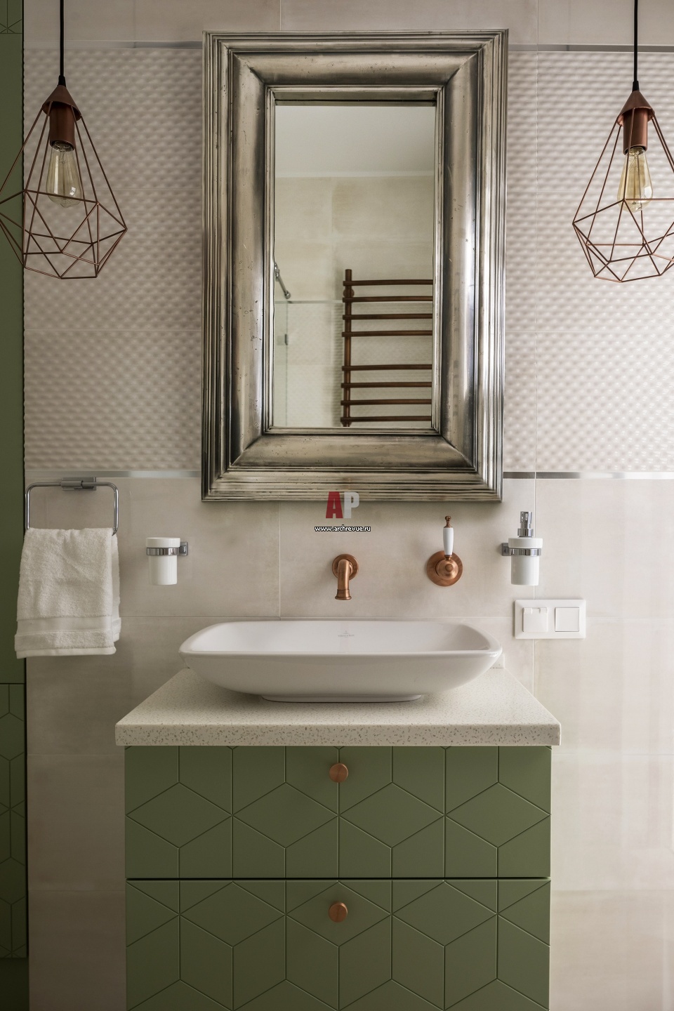Интерьер гостевого санузла. Подстолье под раковину сделано на заказ. Раковина, Villeroy & Boch. Смеситель, Migliore.