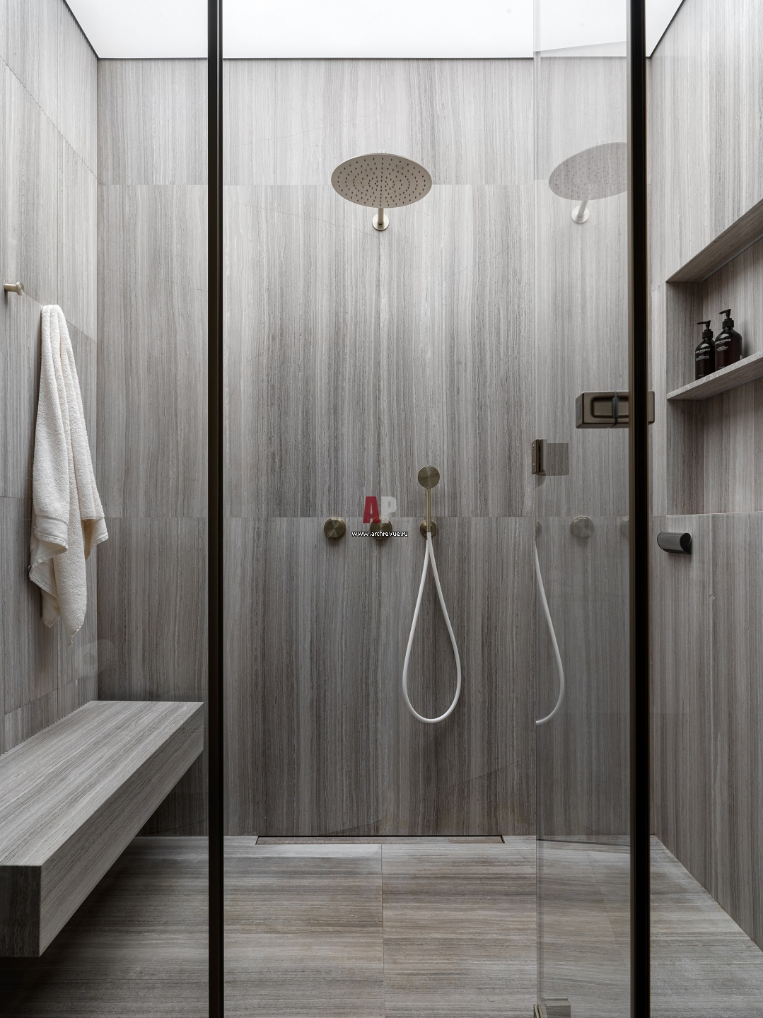 Санузел с большой душевой и лавкой. Мрамор на стенах и полу, Salvatori. Душевое ограждение, Vismara, Vetro. Смесители, Cea.