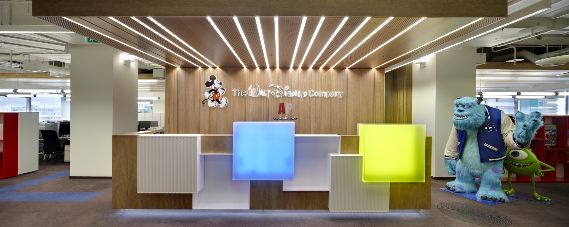 Дизайн интерьера ресепшен в современном офиса. Скульптурная стойка словно набрана из огромных разноцветных кубов, которые подсвечены изнутри. Торцевая стена и потолок зашиты светлым деревом. Изображения и скульптуры героев мультфильмов – визитка офиса.