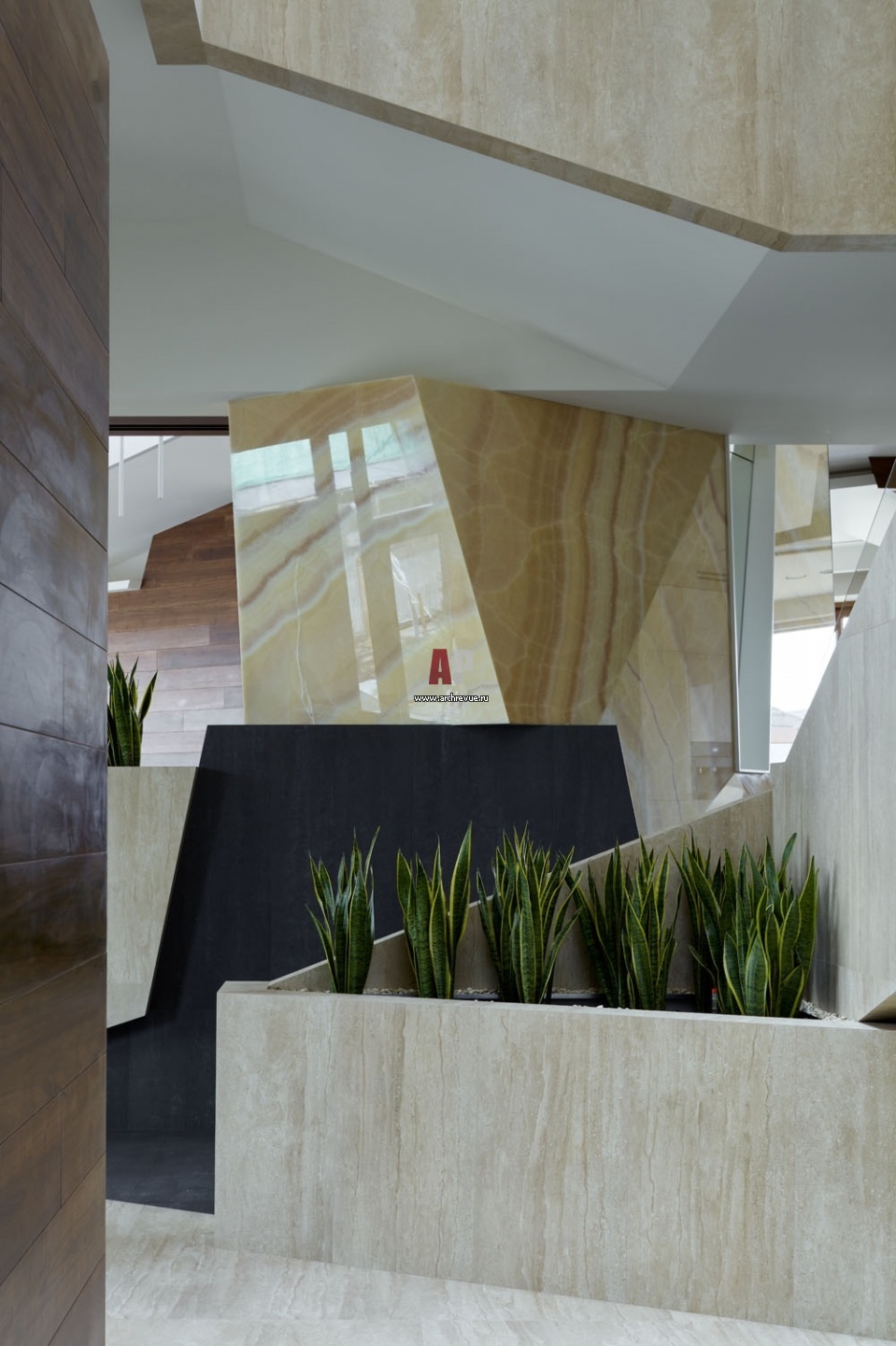 Характерная особенность минималистичного дома – живые растения. Вокруг лестницы для них спроектированы специальные геометрические емкости, на втором уровне задумано вертикальное озеленение.