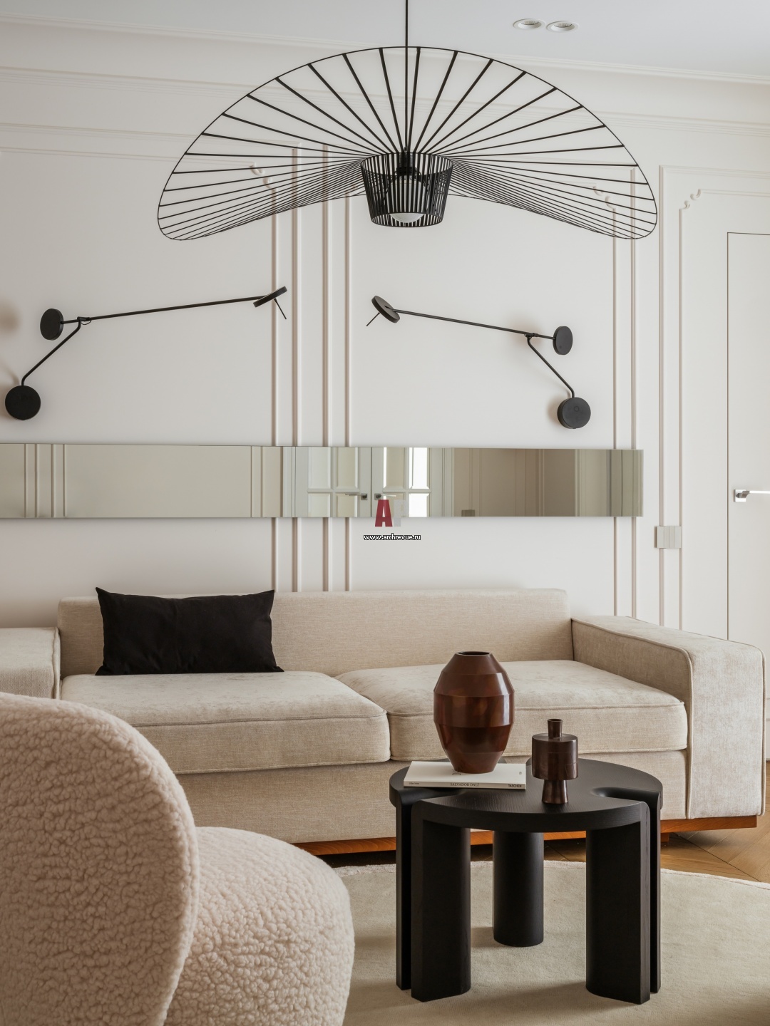Светлая гостиная с обтекаемой элегантной мебелью. Графичные темные линии декора и подвесного светильника привносят в классический французский интерьер ноты Востока