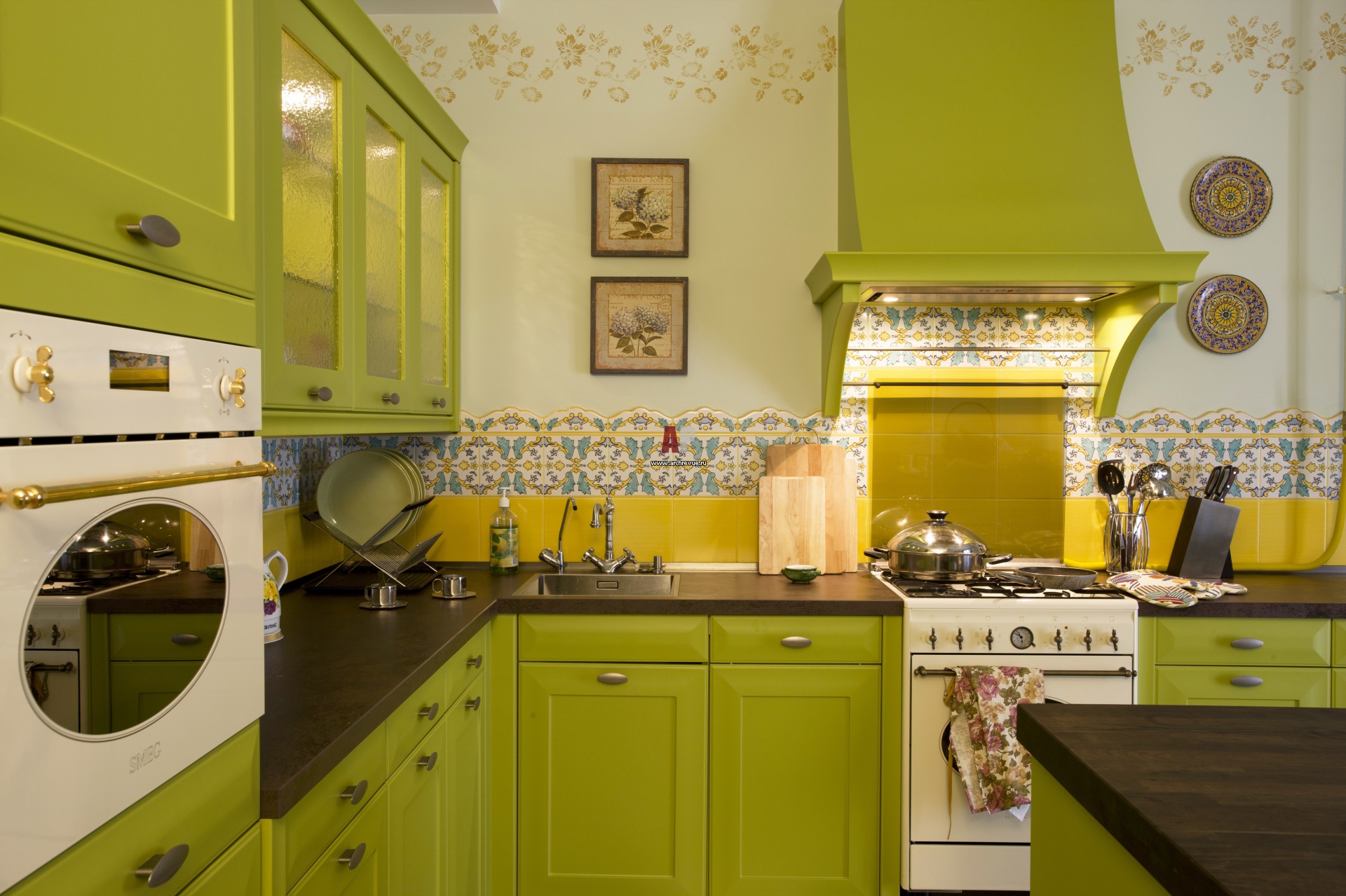 Интерьер кухни. Кухонный фартук выложен керамической плиткой с ручной росписью. Верх стены расписан вручную. Кухонная техника в стиле ретро, Smeg.