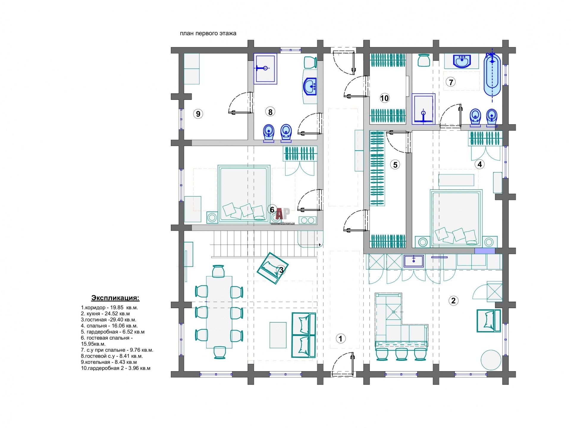 План первого этажа двухэтажного деревянного дома. Общая площадь – 290 кв. м.