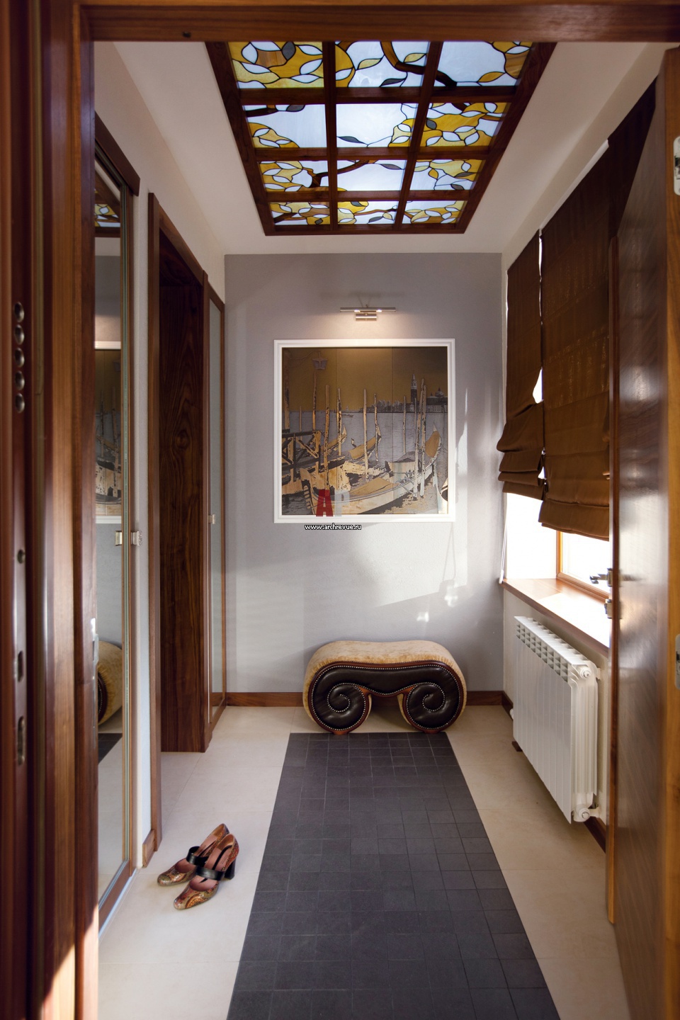Входная зона в стиле ар-деко. Парадный настрой поддерживает потолочный витраж с растительным орнаментом в технике Тиффани. С ним рифмуется напольное панно из черной мелкоформатной плитки.