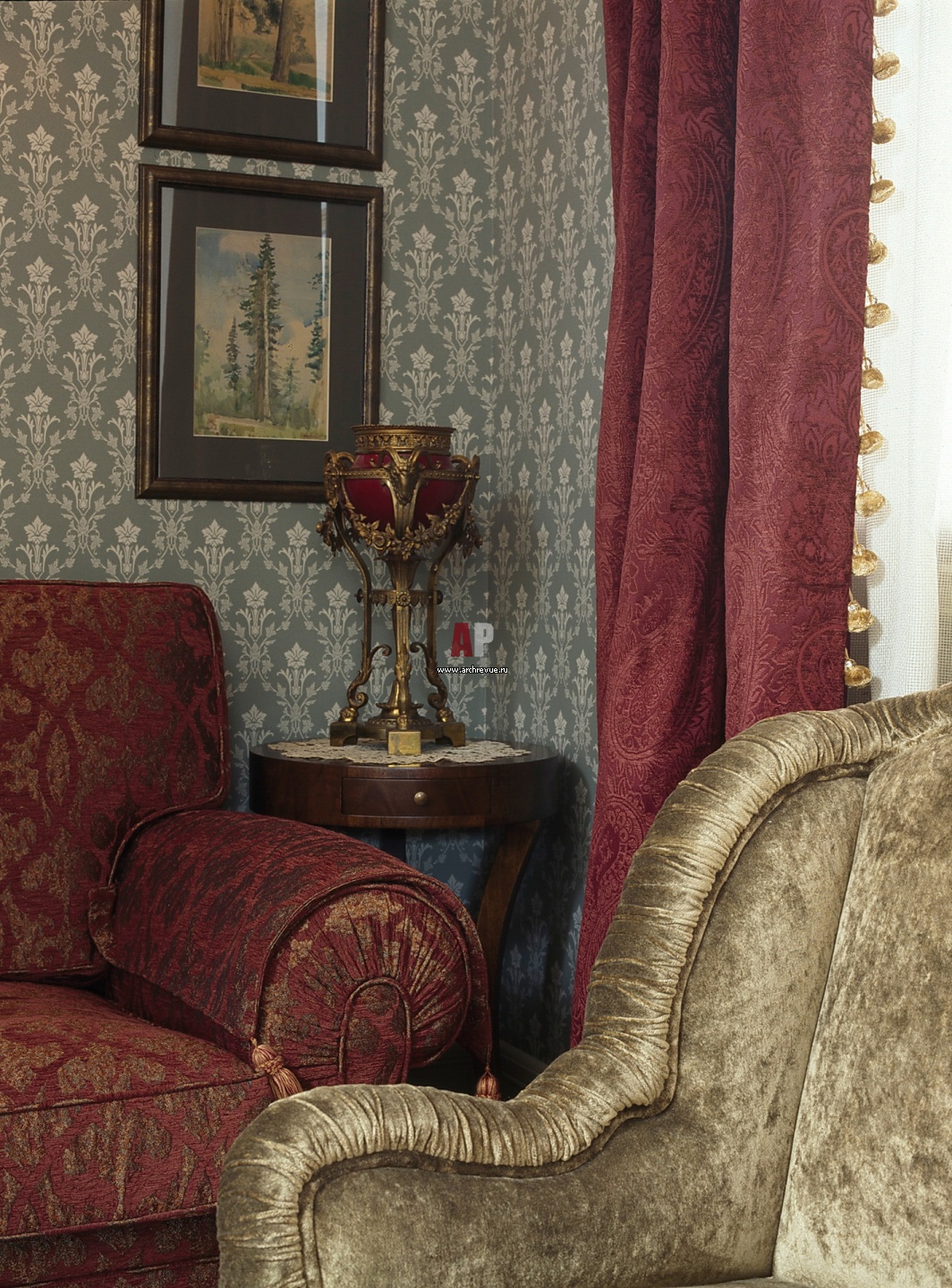 Обои с плотным орнаментом, Sanderson. Обивка диванов и портьеры глубокого бордового цвета.