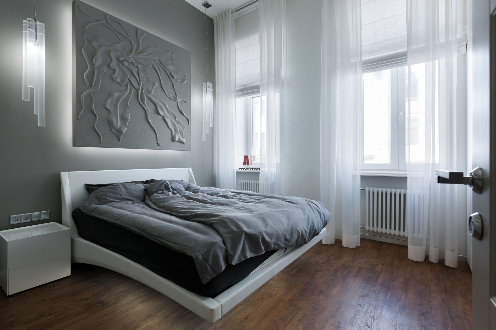Интерьер спальни выдержан в серых тонах. Главное украшение помещения – масштабное гипсовое панно с изображением орхидей над кроватью. Светильники, Italamp. Кровать, прикроватные тумбочки, Cattelan Italia.