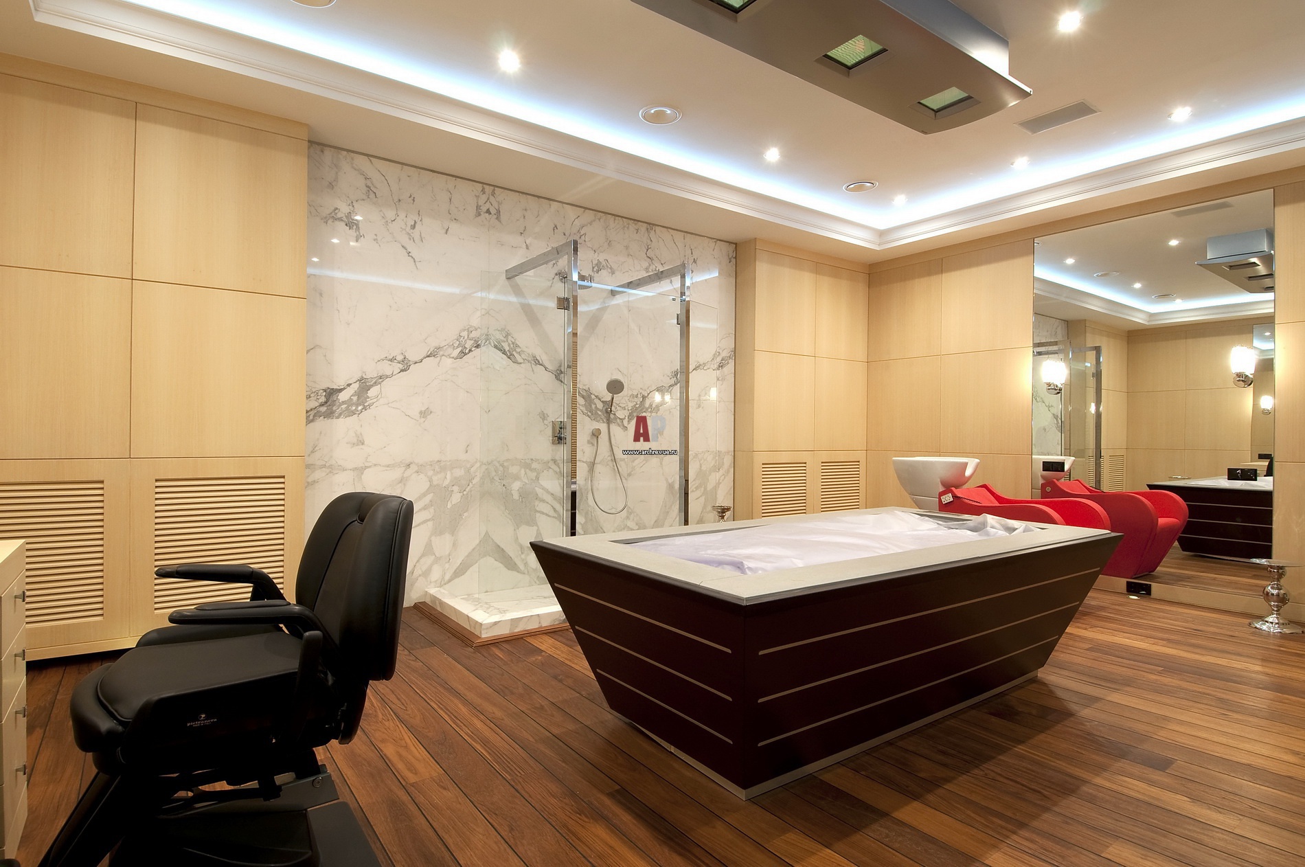 В зоне SPA смонтировано оборудование Klafs и Techno Design. Зона душевой кабины и поддон облицованы слэбами мрамора, поставщик «Новый камень».