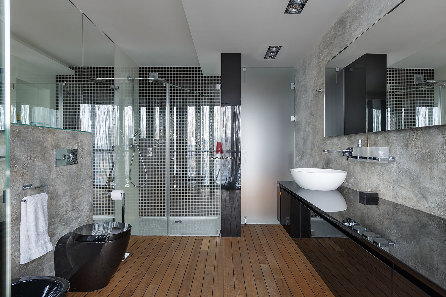 Черная сантехника Rifra хорошо читается на фоне бетонных поверхностей.
